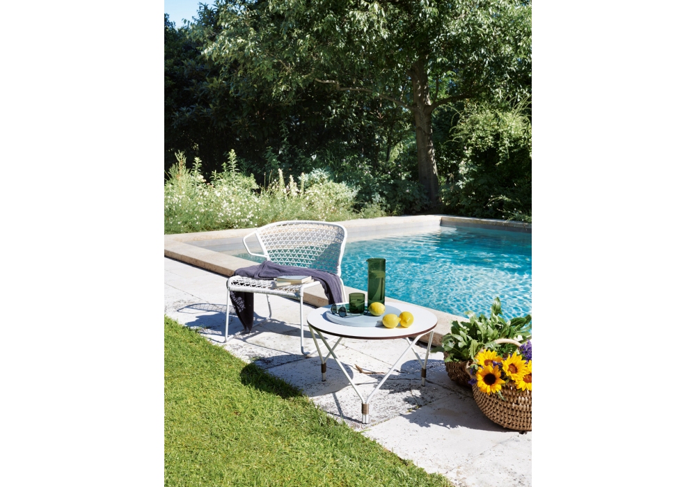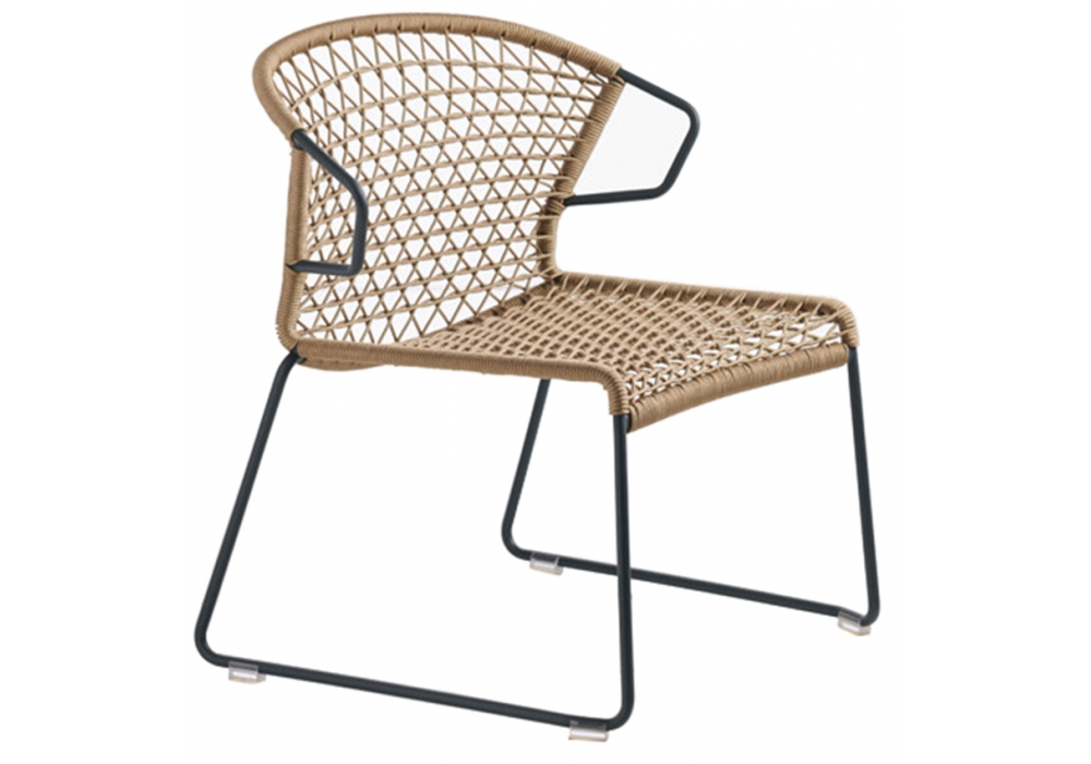 Vela designed by Hannes Wettstein for Potocco is an outdoor lounge armchair entirely structured in painted metal in different finishes. Seat and back are covered with a hemp or PVC rope weave in different colors.