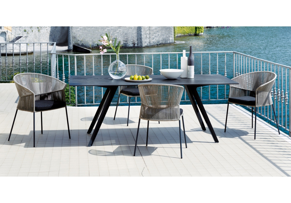 Ola designed by Radice Orlandini for Potocco is an outdoor armchair entirely structured in painted metal in different finishes. Seat and back are covered with an 8 mm Fly rope weave. Cushion cover in different fabrics.