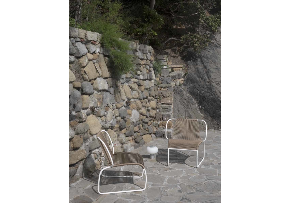 Tibes designed by Gregorio Facco for Potocco is an outdoor lounge armchair entirely structured in tubular metal painted in different finishes. Seat and backrest are covered with a weaving of hemp or dark brown rope.