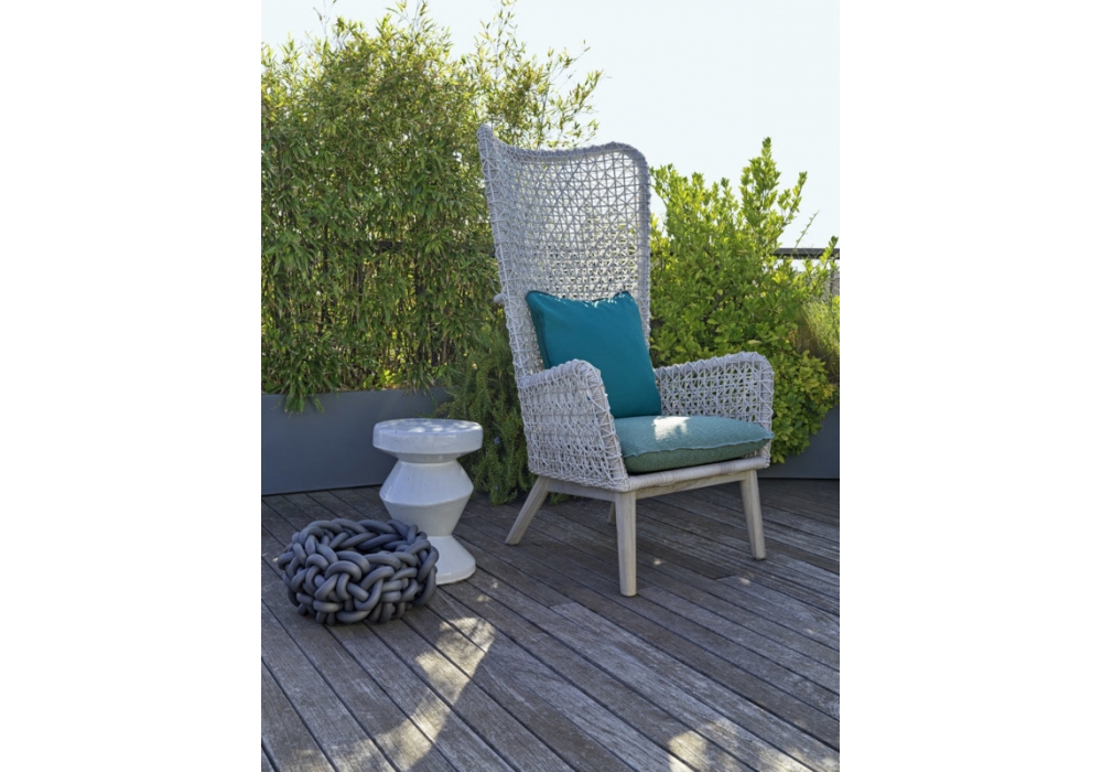 Panda designed by Paola Navone for Gervasoni is a bergere armchair made with hand-woven aluminum structure in white / gray melange Panda Resin and aged teak feet. Cushions with removable cover.