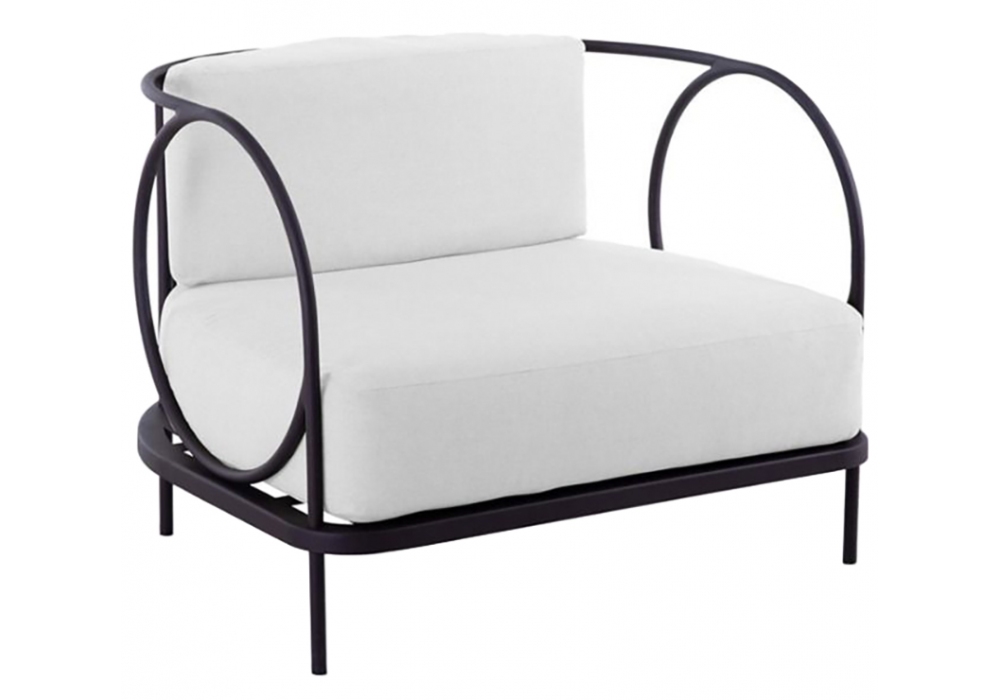 Ariete designed by Adam D. Tihany for Unopiù is an armchair with structure in hand-worked wrought iron painted in bronze color. The seat and back cushions are made of fabric and are available in different colors.