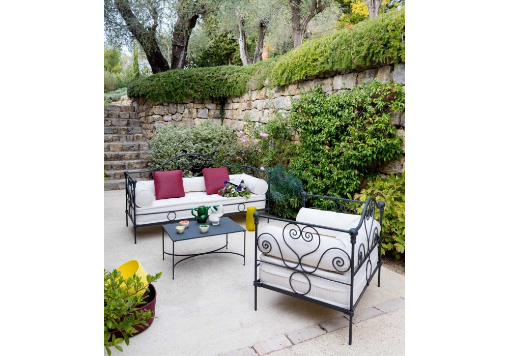 Aurora produced and designed by Unopiù is an armchair with hand-forged iron structure painted in graphite color. The seat and back cushions are made of milk-colored acrylic fabric.
