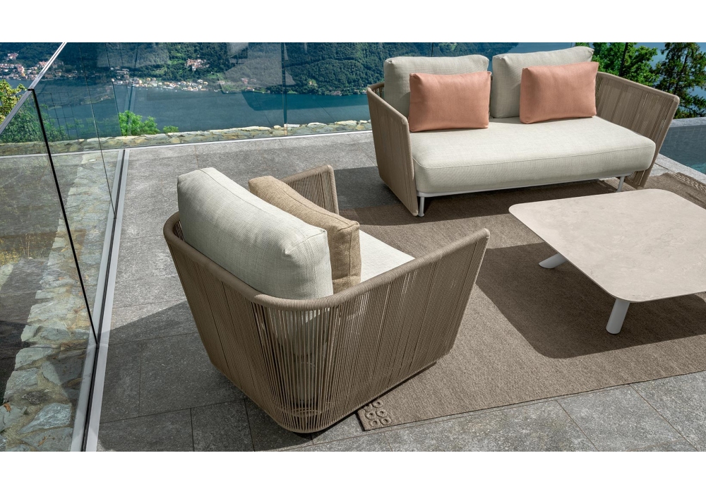 Coral designed by Marco Acerbis for Talenti is an outdoor armchair with structure in powder-coated aluminum. Backrest structure covered with a synthetic rope weave. Cushions have removable covers and are upholstered in weather resistant outdoor fabrics.