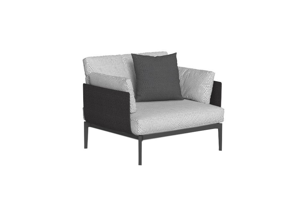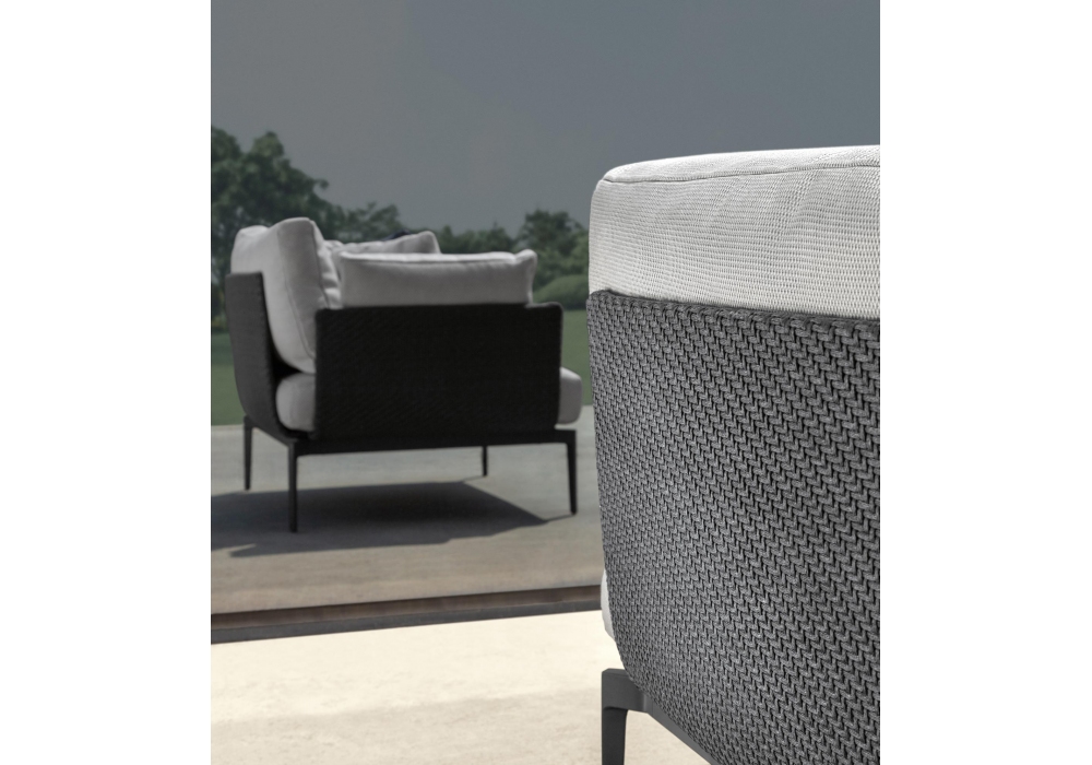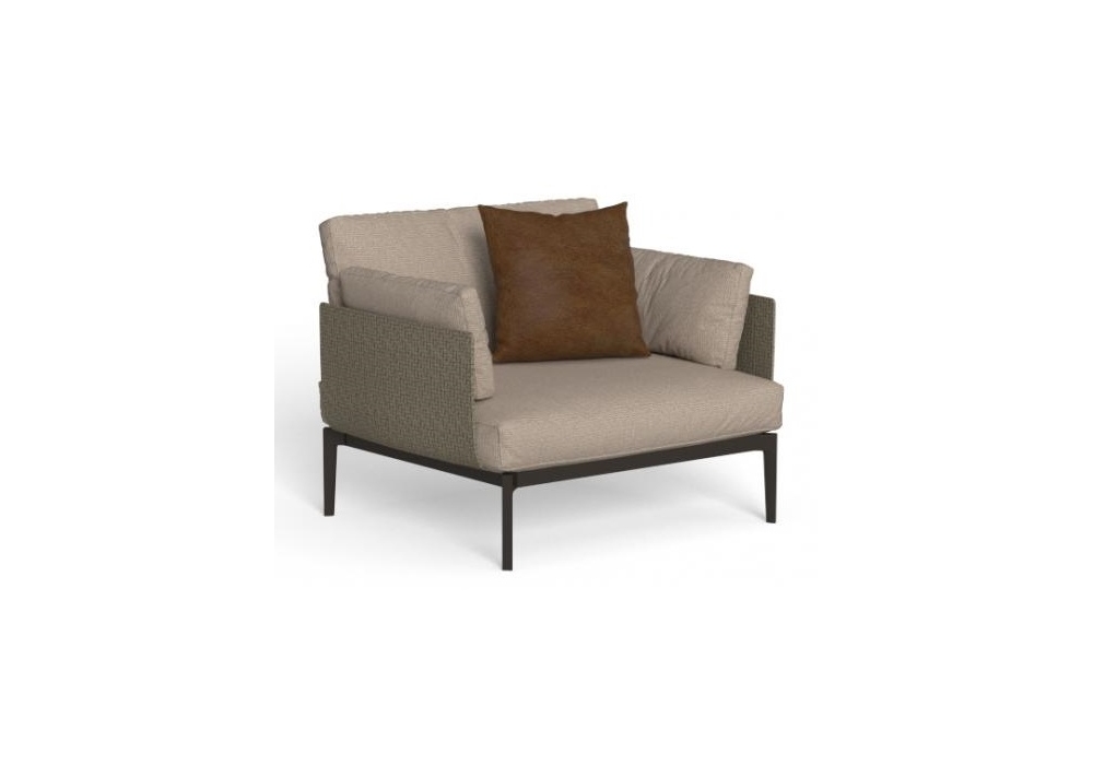 Leaf designed by Marco Acerbis for Talenti is an outdoor armchair with structure in powder-coated aluminum. Armrests and backrest upholstered in woven technical fabric. Cushions have removable covers and are upholstered in weather resistant outdoor fabrics.