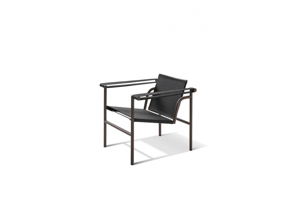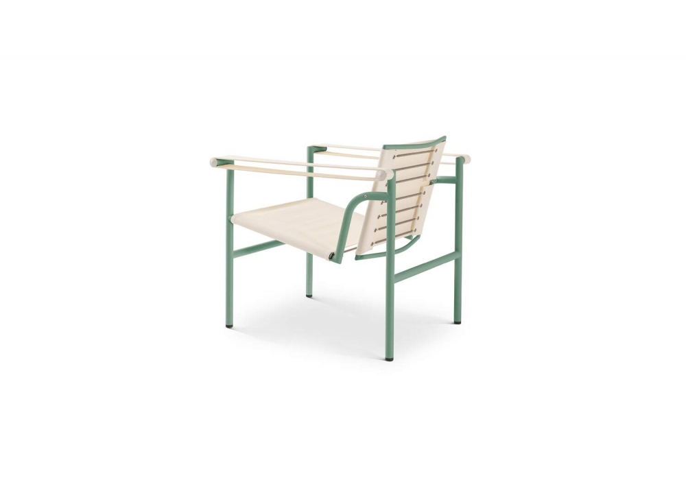 1 Fauteuil Dossier Basculant, Outdoor designed by Le Corbusier, Pierre Jeanneret, Charlotte Perriand for Cassina is a small armchair made with a painted stainless steel structure and fabric upholstery.