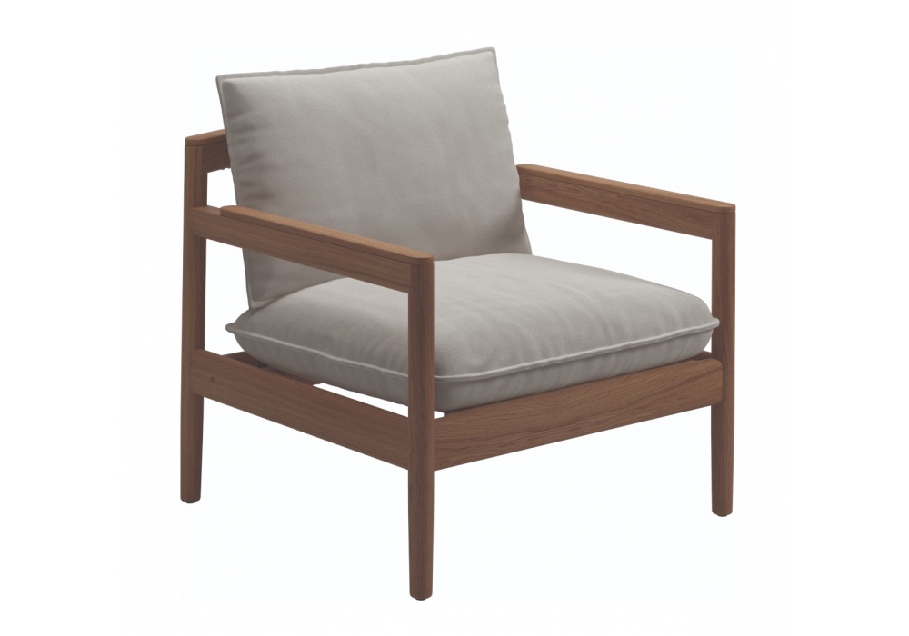 Saranac designed by Mark Gabbertas for Gloster is an outdoor lounge chair with natural teak structure, woven rope seat and back, and outdoor fabric upholstered coshions.