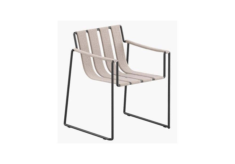 Strappy designed by Kris Van Puyvelde for Royal Botania is an outdoor armchair with structure in painted stainless steel and is characterized by a continuous tubular that develops into a minimalist, functional and stackable structure to which the padded straps and armrests are fixed. Available in different finishes.