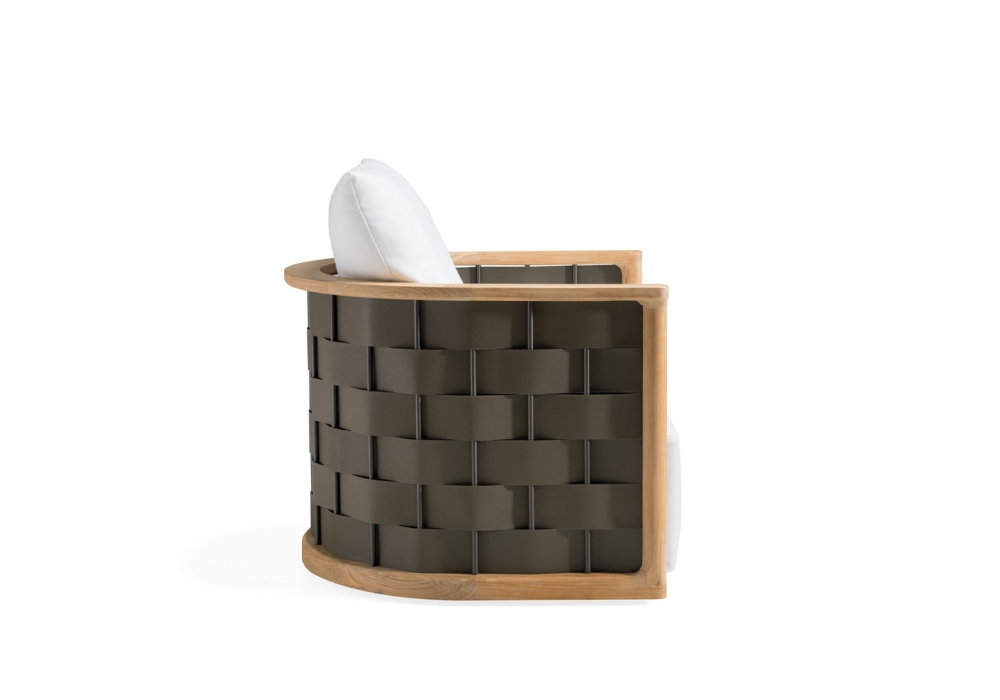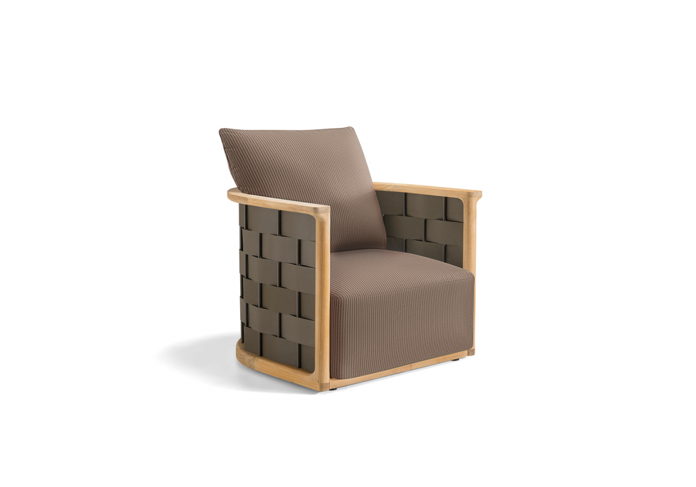 Palinfrasca designed by Vincent Van Duysen for Molteni&C is an armchair made with structure in solid teak, shell with woven bands in teak or in olive green polyurethane EVA. Polyurethane padding and fabric upholstery. Optional backrest cushion.