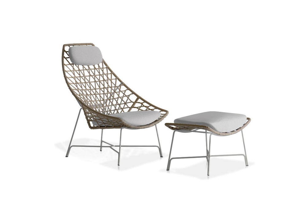 Cut designed by Stephan Veit for Potocco is a armchair bergère with structure in steel rod painted with epoxy powders and weaving in beige gas tape. Seat cushion and headrest upholstered in fire retardant polyurethane foam upholstered in various outdoor fabrics.