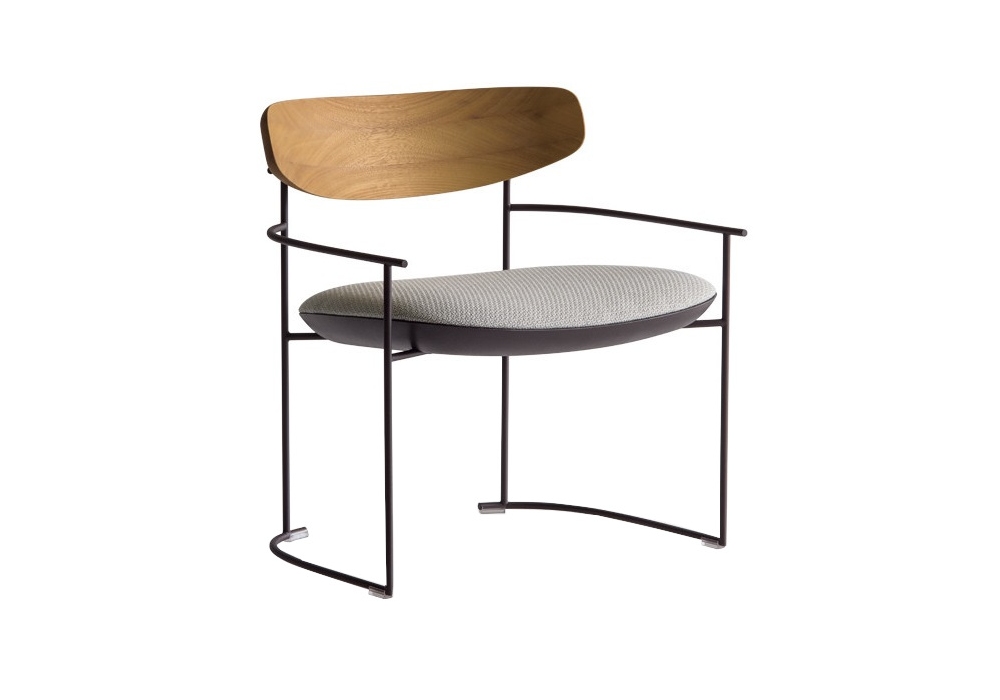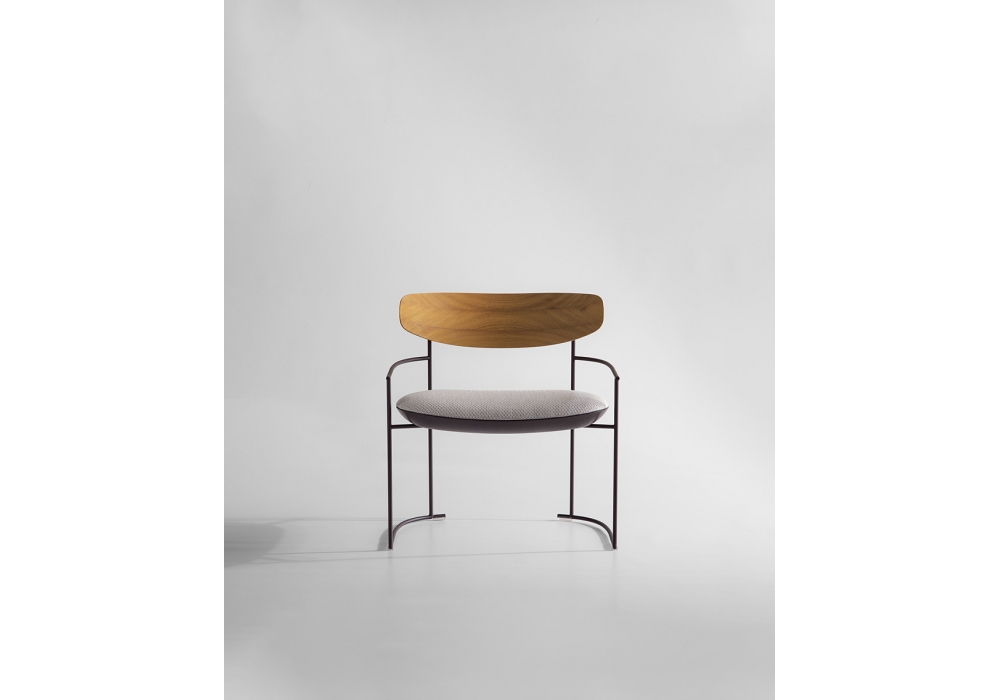 Keel Light Outdoor designed by M + V for Potocco is an armchair with structure in embossed painted metal rod, back in solid Iroko and seat upholstered in fire retardant polyurethane foam upholstered in different fabrics with underlying rigid shell painted in acrylic for outdoor use, in same color and fine embossing as the barrel.