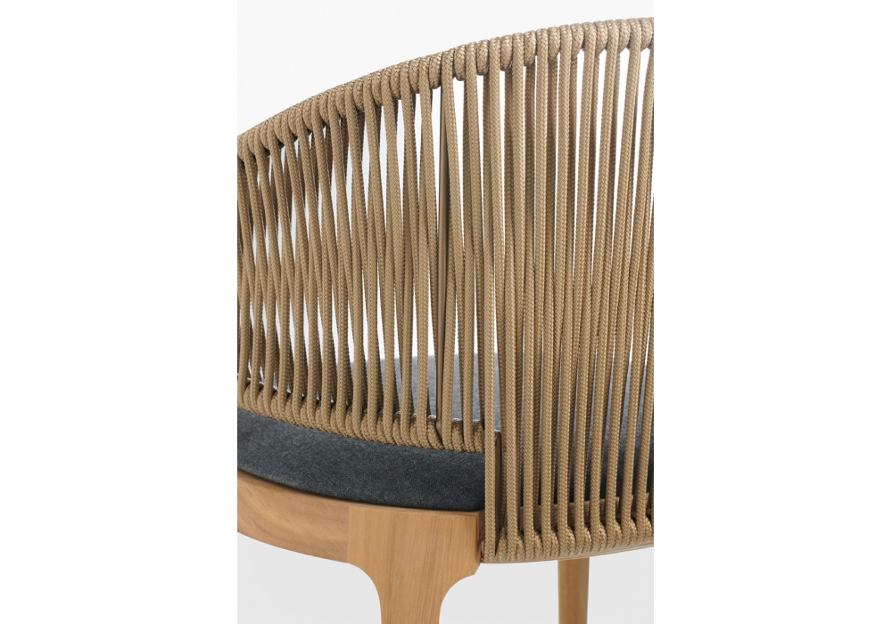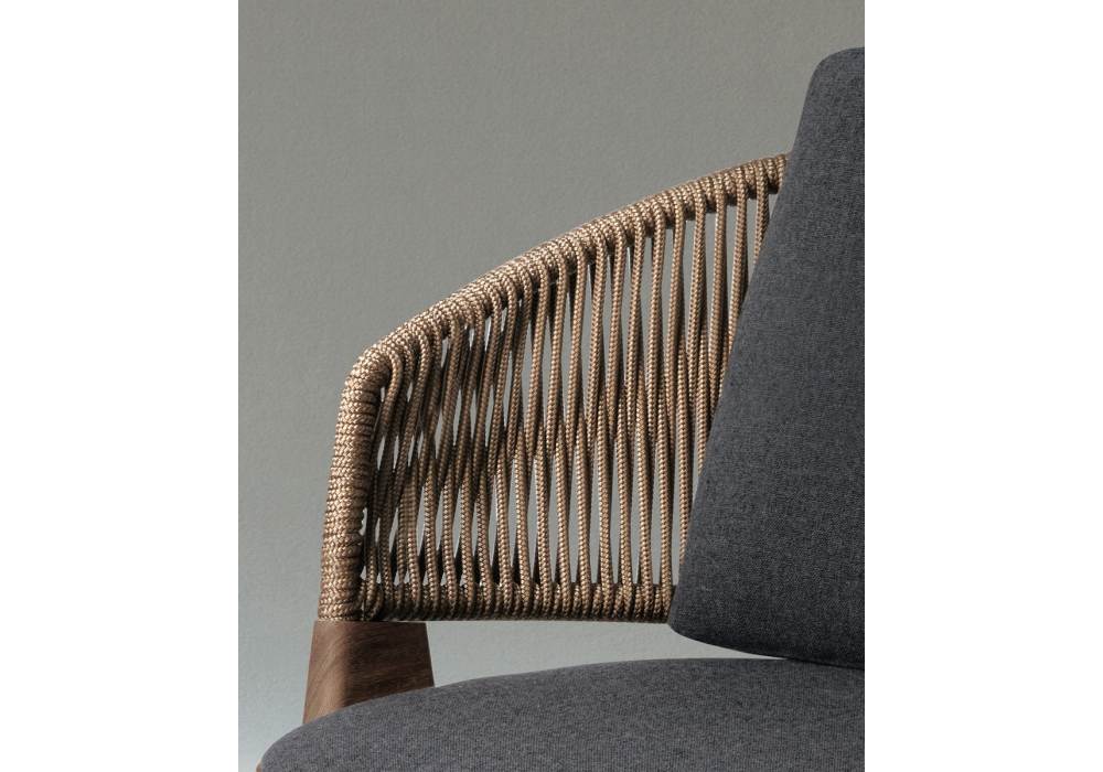 Velis designed by Mario Ferrarini for Potocco is an outdoor cockpit armchair with structure in solid iroko and back with painted metal structure hand-woven in “Gassa” cord or nautical hemp rope, seat upholstered in fire retardant polyurethane foam and upholstered with finishes and collection outdoor coverings.
