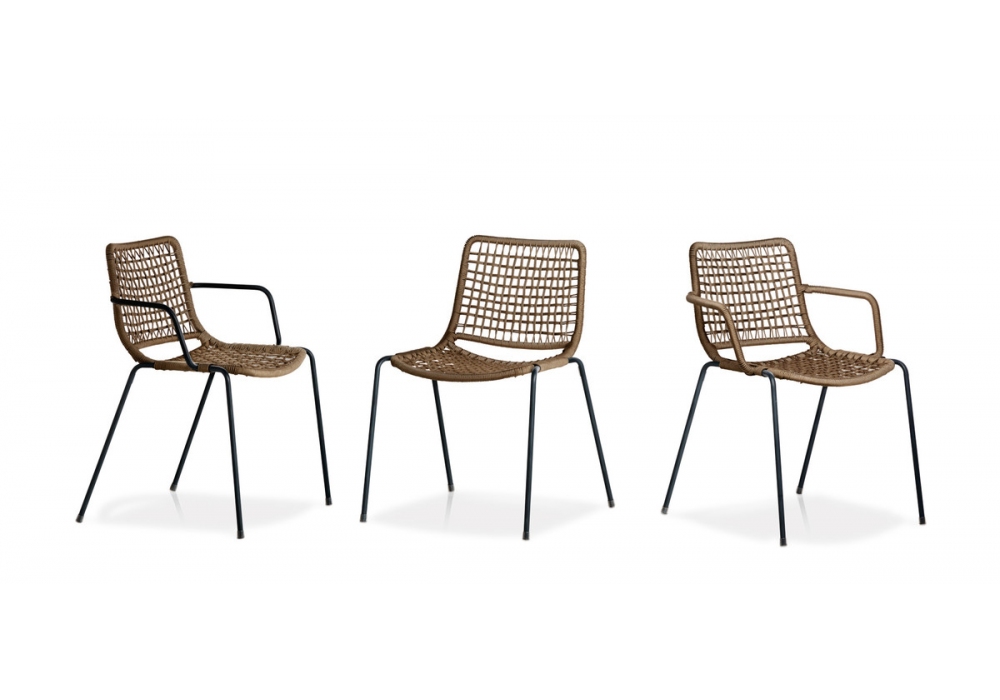Egao designed by Toan Nguyen for Potocco is an outdoor small armchair with legs in painted stainless steel tube and weaving in moka synthetic cord or rope. Available in the version with metal armrests matching the structure or in woven cord.
