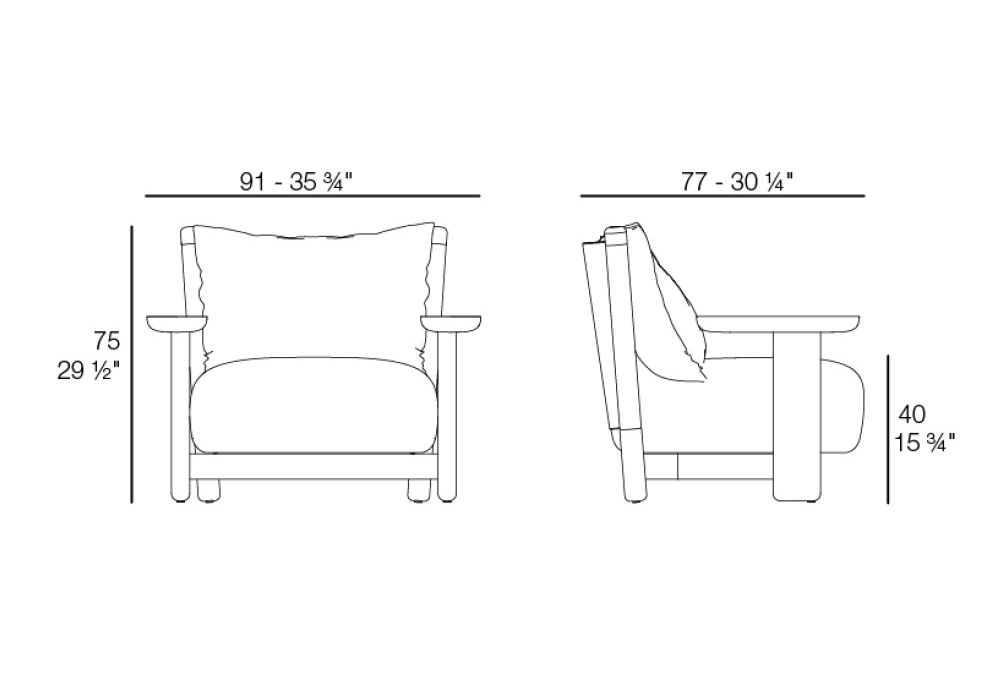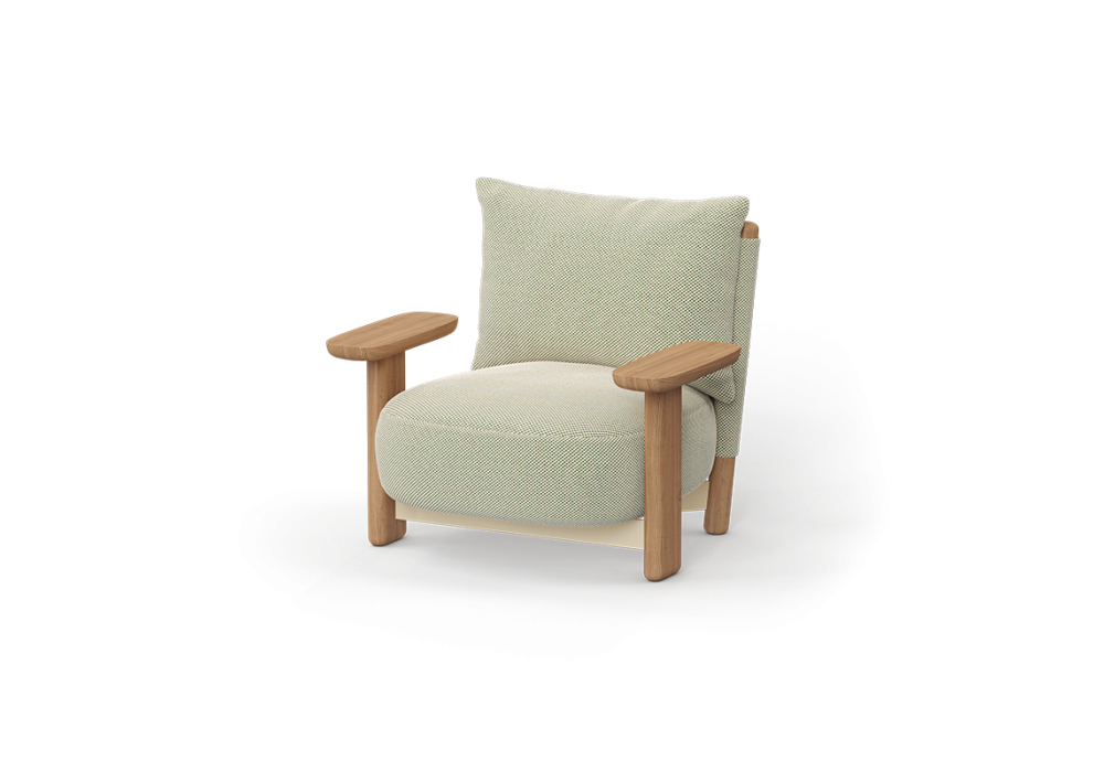 Milos Wood Lounge Chair designed by Jean Marie Massaud for Vondom is an armchair made with wooden structure and seat and backrest cushions with fabric upholstery.