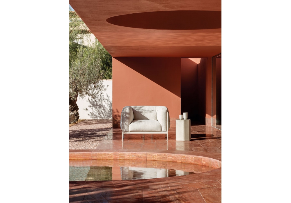 Obi designed by Ludovica + Roberto Palomba for Expormim is a lounge chair made of aluminum, padded cushions covered in fabric. Available in different finishes.