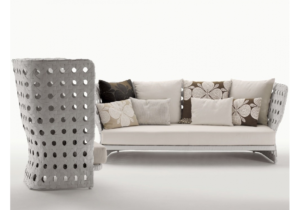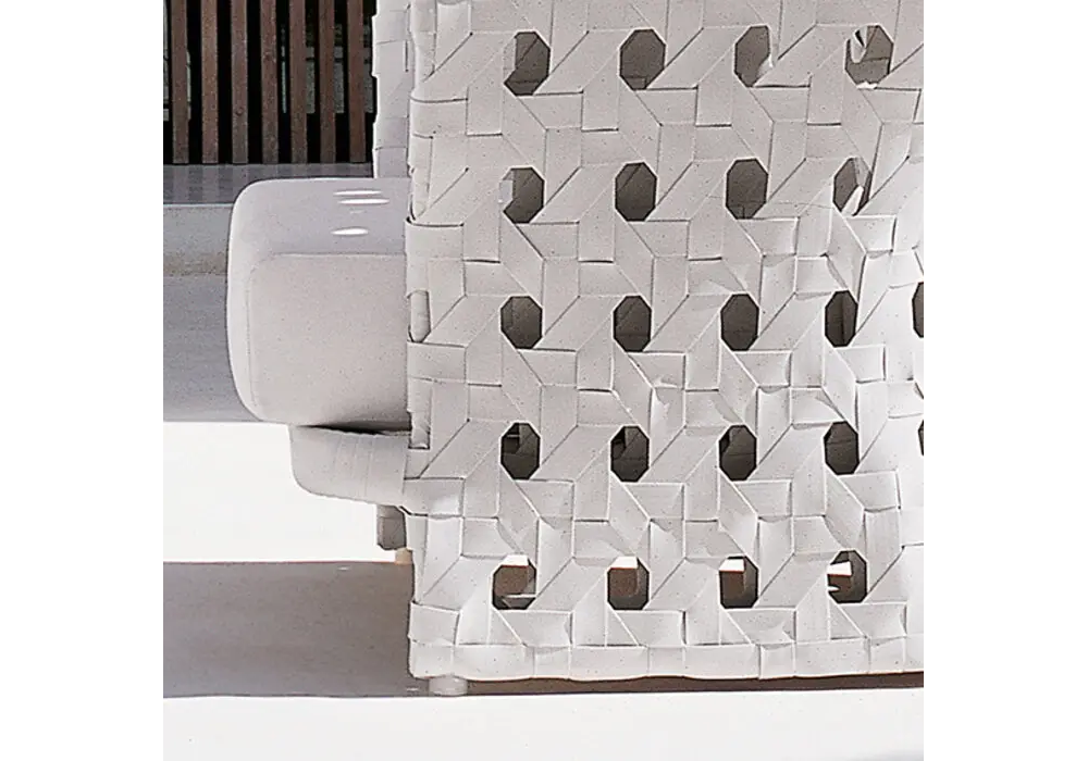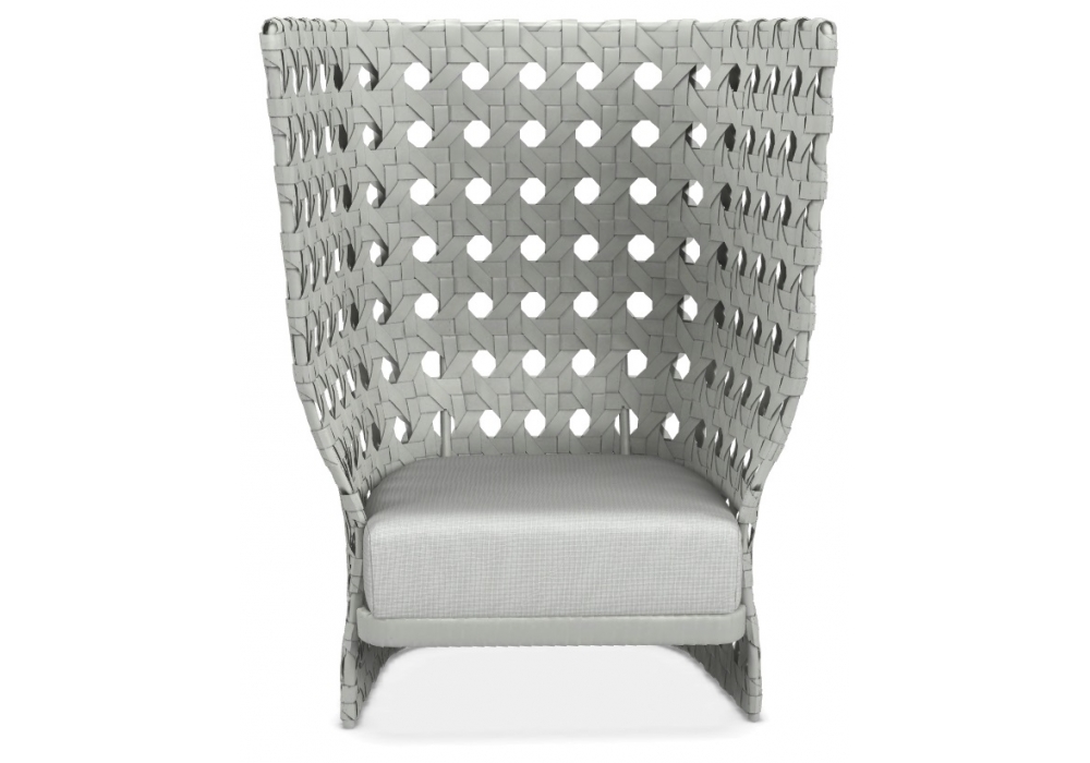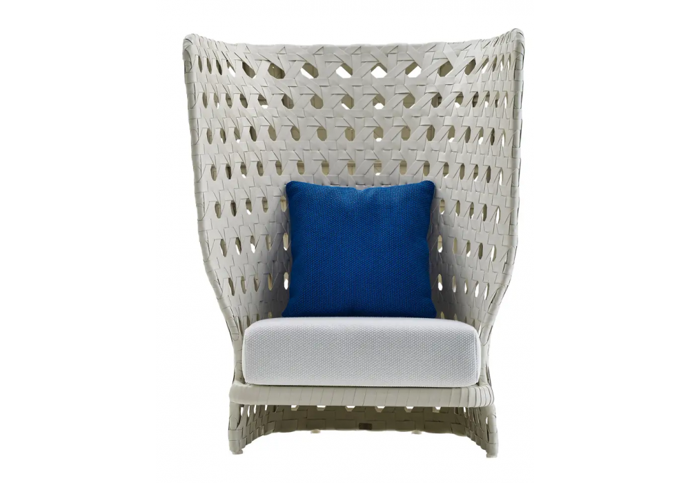 Canasta designed by Patricia Urquiola for B&B Italia Outdoor is an armchair with high back with a white painted aluminum frame and white polyethylene fiber weave. Seat upholstery in different fabrics.