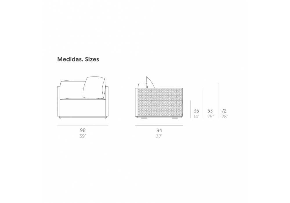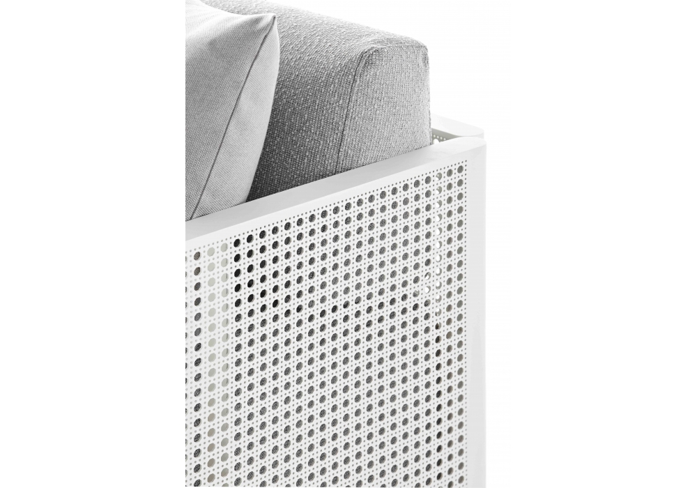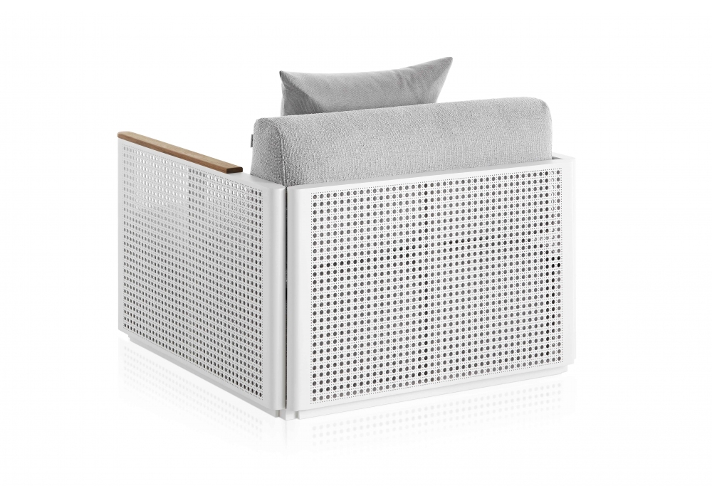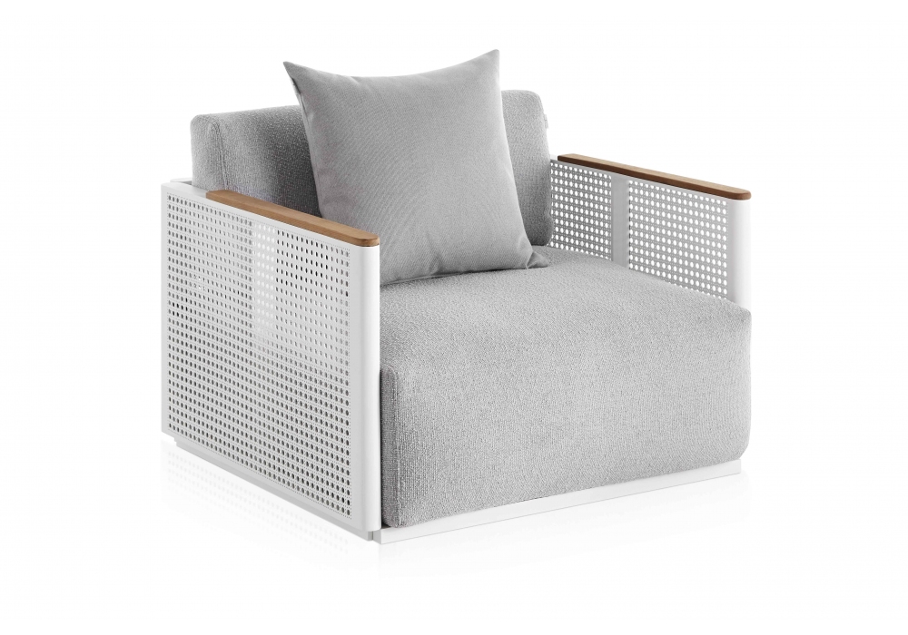 Bosc designed by Made Studio for Gandia Blasco is a designer lounge chair made of powder-coated welded aluminium and micro-perforated sheet metal that reproduce handmade wicker patterns, armrest in iroko wood, seat, backrest and cushion in reusable polyuerethane foam rubber with polyester fiber water-repellent. Available in different finishes. Cuschions are included.