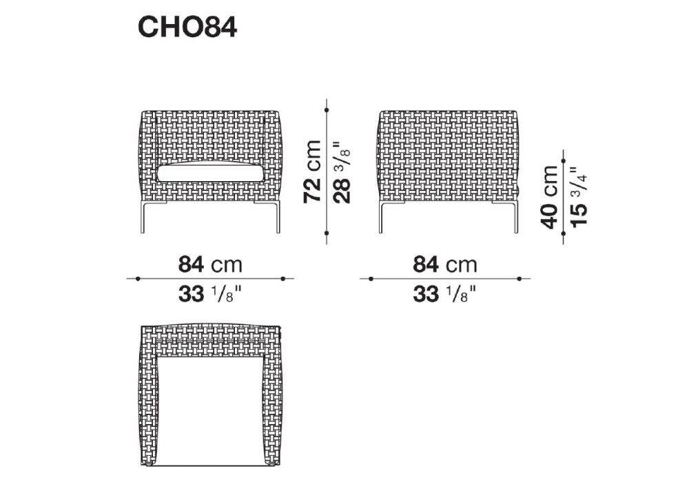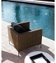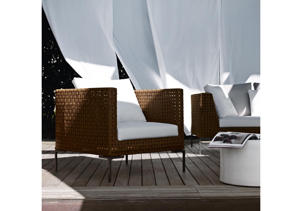 Charles Outdoor designed by Antonio Citterio for B&B Italia Outdoor is an armchair with covering in fabric, interlacing in brown polypropylene, feet in bronzed nickel painted aluminium die-cast. Seat cushion in shaped polyurethane and back cushion in polyester fibre.