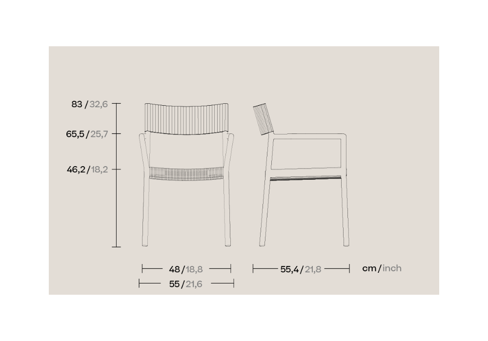Passage Outdoor designed by Ronan Bouroullec for Kettal is an outdoor armchair with a metal frame in a glossy or textured finish. The seat is made of aluminum or rope in the same color as the frame.