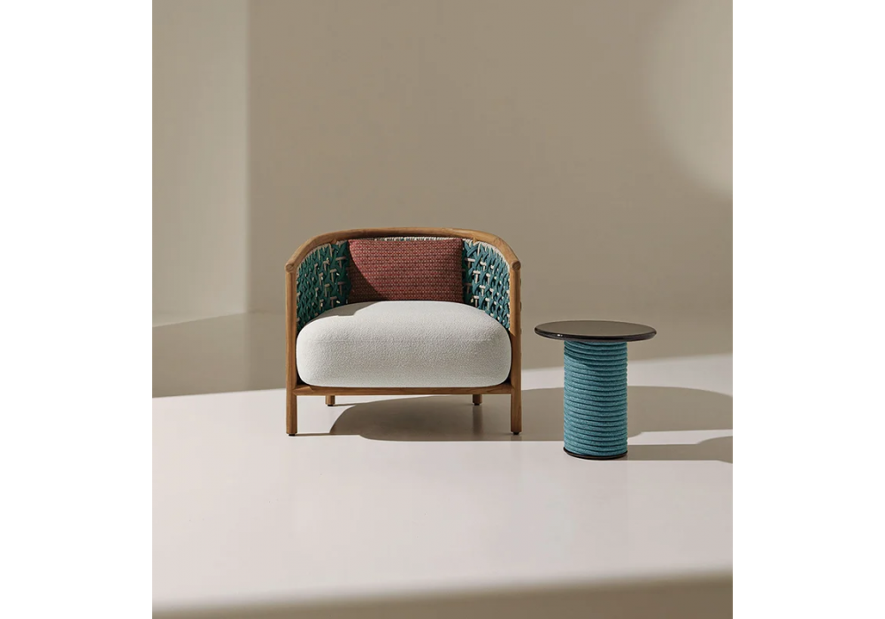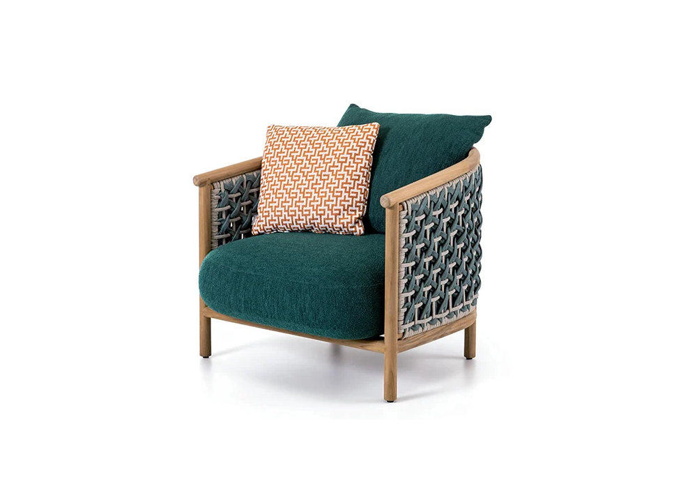 Patio designed by Zanellato / Bortotto for Ethimo is an armchair with a natural teak structure and a backrest with woven fabric. Seat and backrest cushions in polypropylene.