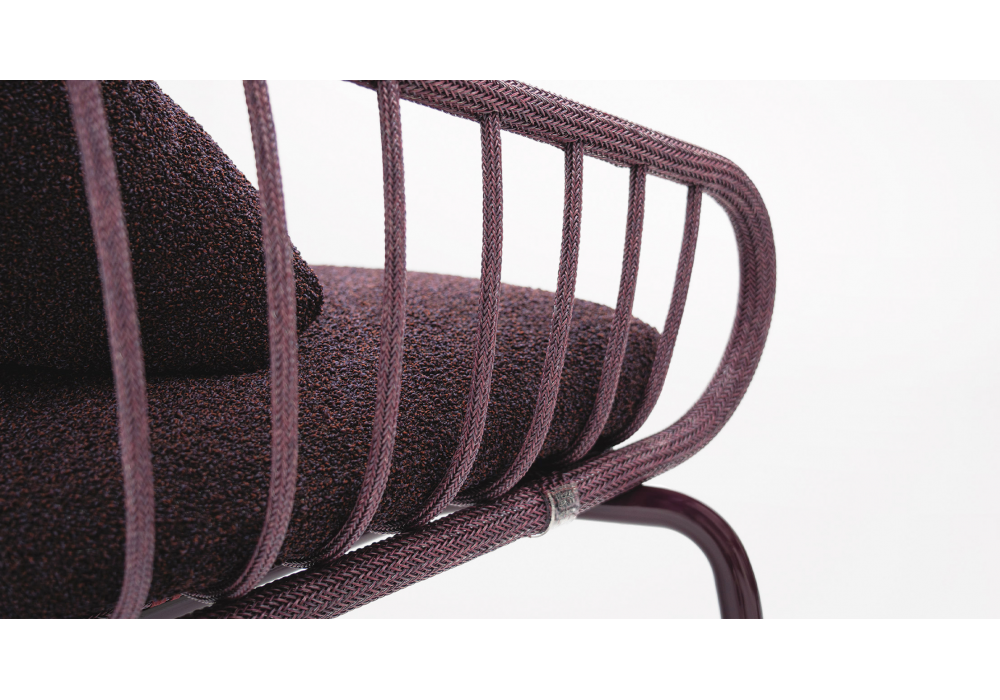 Erica designed by Gianluca Abbadessa for Paola Lenti is a curved aluminum small armchair. Base in glossy painted aluminum with plastic tips and aluminum shell with Twiggy yarn weave. Seat and back cushion upholstery in removable fabric in a wide selection of finishes.