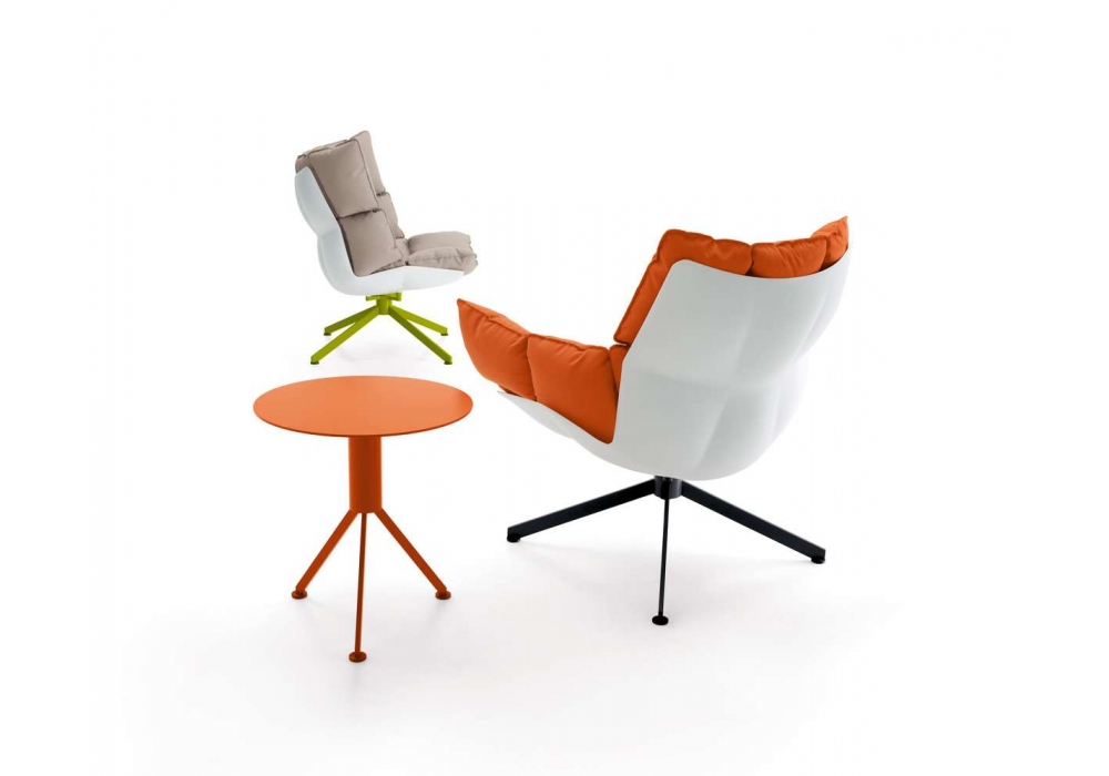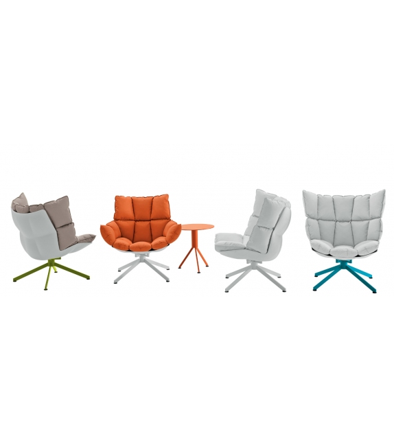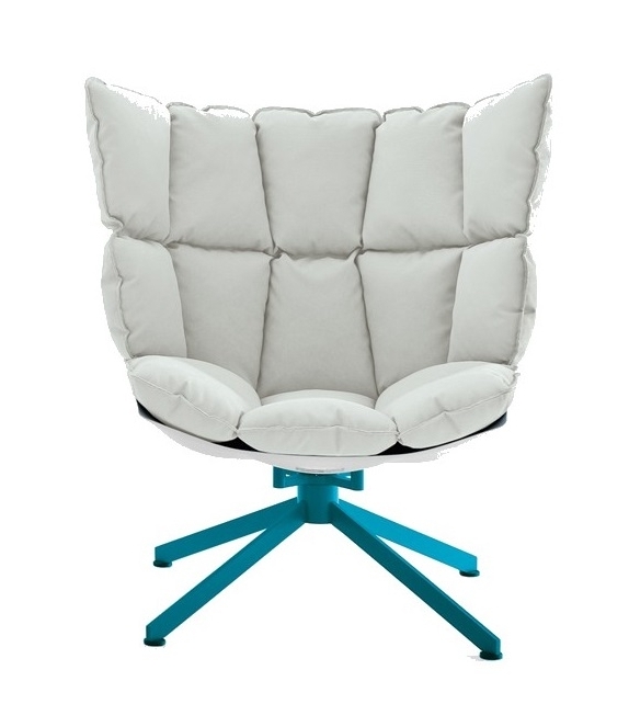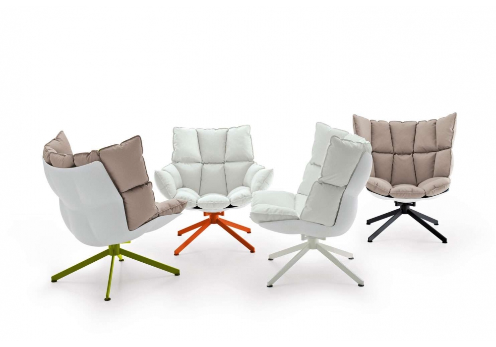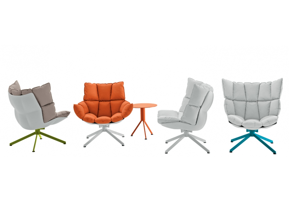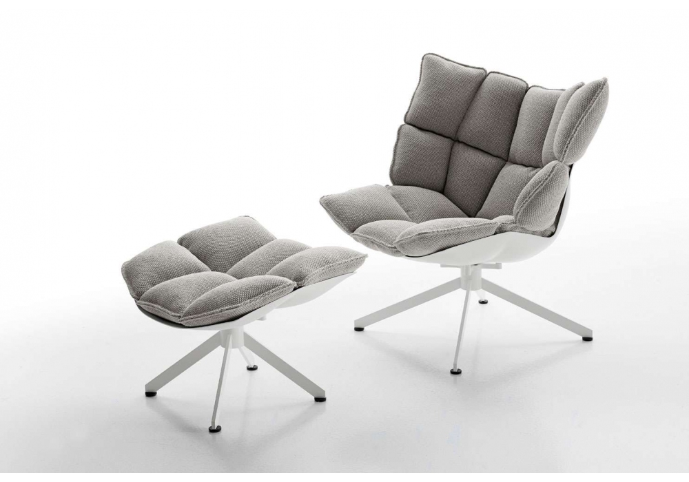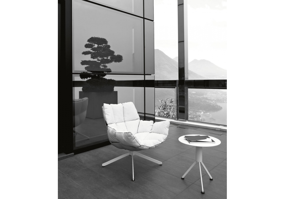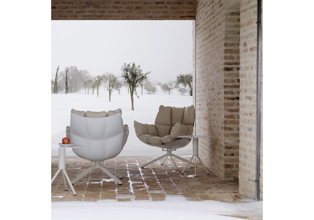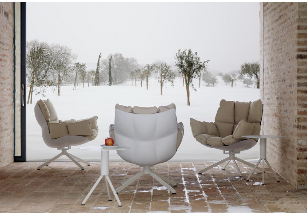 Husk designed by Patricia Urquiola for B&B Italia Outdoor is an armchair with a shell in Hirek® plastic material in a white finish and a painted aluminum base. Upholstery in different fabrics. Available in two dimensions.