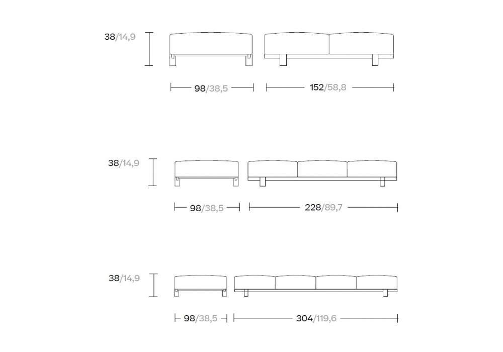 | Dimensions | 152 x 98 x H 38 cm; 228 x 98 x H 38 cm; 304 x 98 x H 38 cm. |