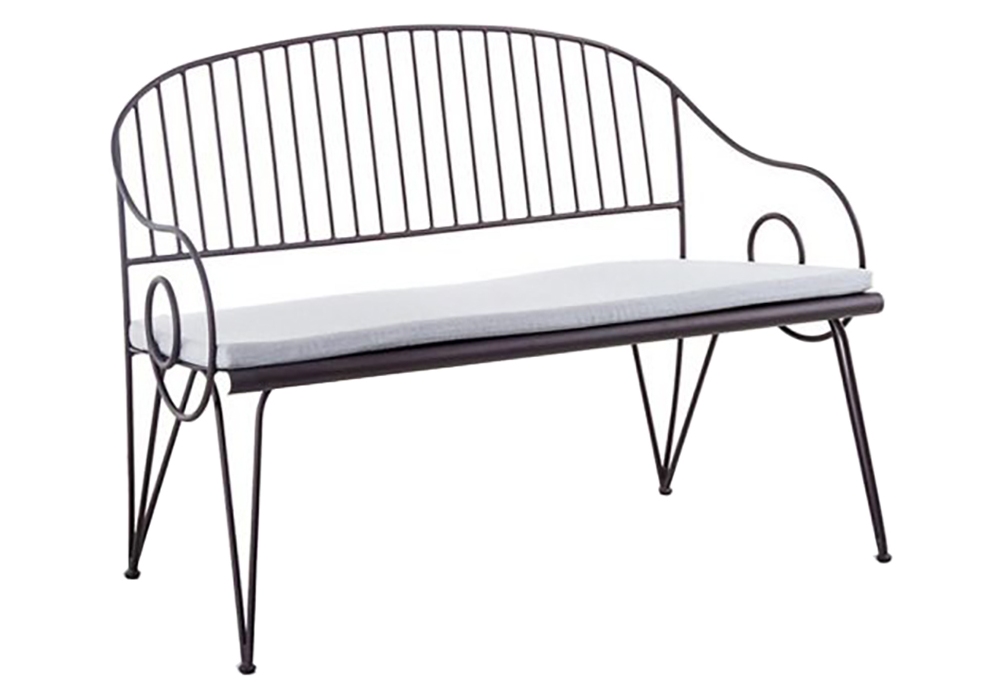 Ariete designed by Adam D. Tihany for Unopiù is a bench with structure in hand-worked wrought iron painted in bronze color. The seat cushions are made of fabric and are available in different colors.