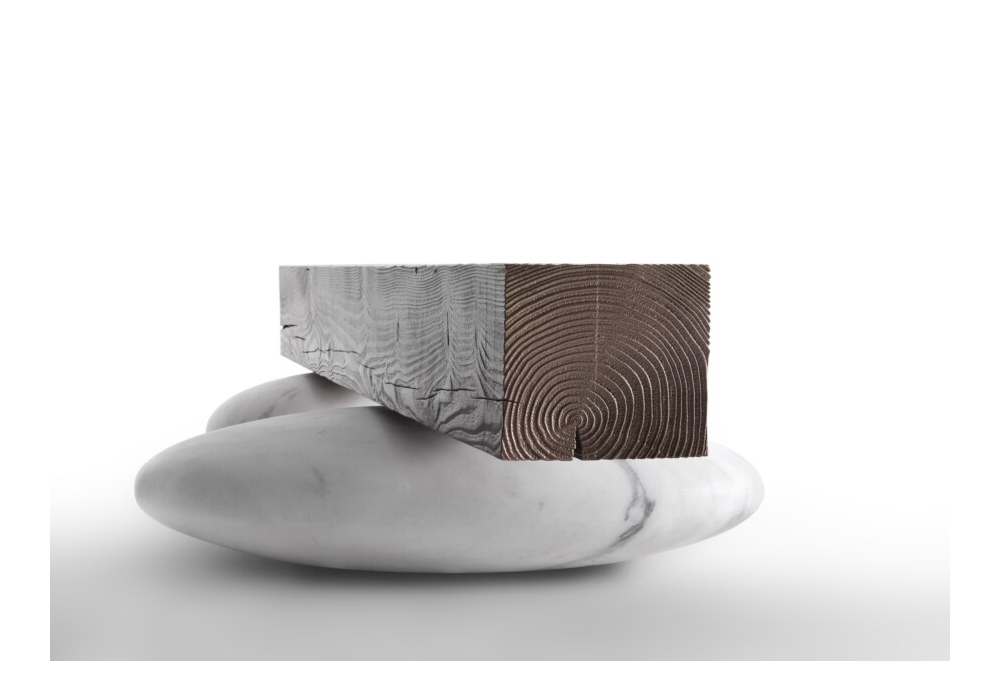 Pavè Log designed by Enzo Berti for Kreoo is a bench with base made of two marble "pebbles" in different finishes and seat in larch wood veneer or covered in natural leather. On request it is possible to customize the seat in RAL colors with a glossy finish. Seat and base are joined together by a metal fastening element. Available in different dimensions.