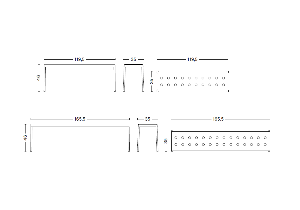 | Dimensions | 119.5 x 35 x H 46 cm; 165.5 x 35 x H 46 cm. |