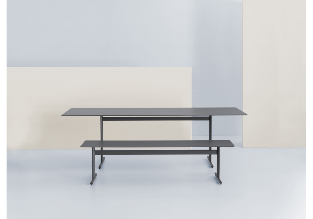 Graphic Outdoor designed by Victor Vasilev and Mario Ferrarini for Potocco is an outdoor bench with base in painted metal and seat in anthracite HPL. Upon request, fabric cushions can be purchased.