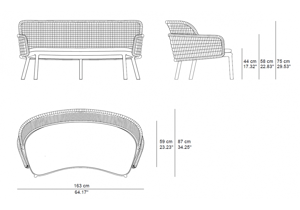 Suro designed by Christophe Delcourt for Tribù is an outdoor bench with armrests with a structure entirely made of clay-coloured painted aluminum or teak wood. The backrest is entirely covered in woven linen or hemp rope. The seat is enriched with cushions covered in fabric. Suro is available in different finishes.