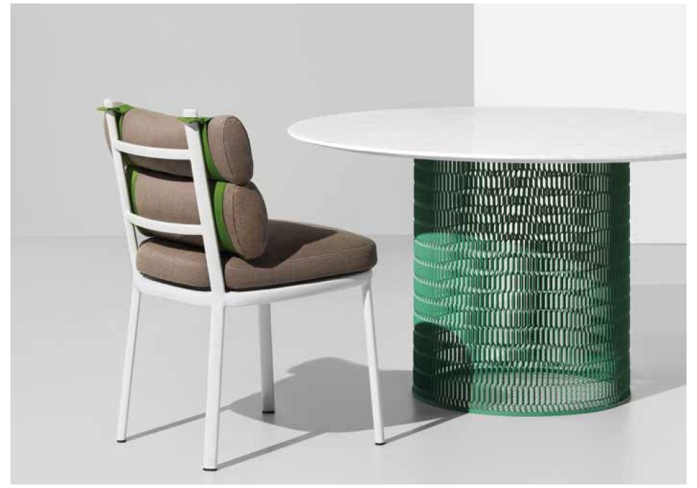 Roll designed by Patricia Urquiola for Kettal is a chair with a painted aluminum structure. The seat and backrest cushions are padded and covered in fabric, with the backrest anchored by fabric straps. Roll is available in different frame and upholstery finishes.