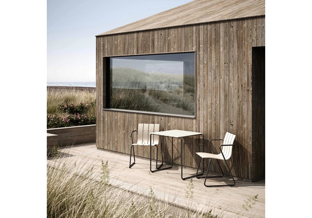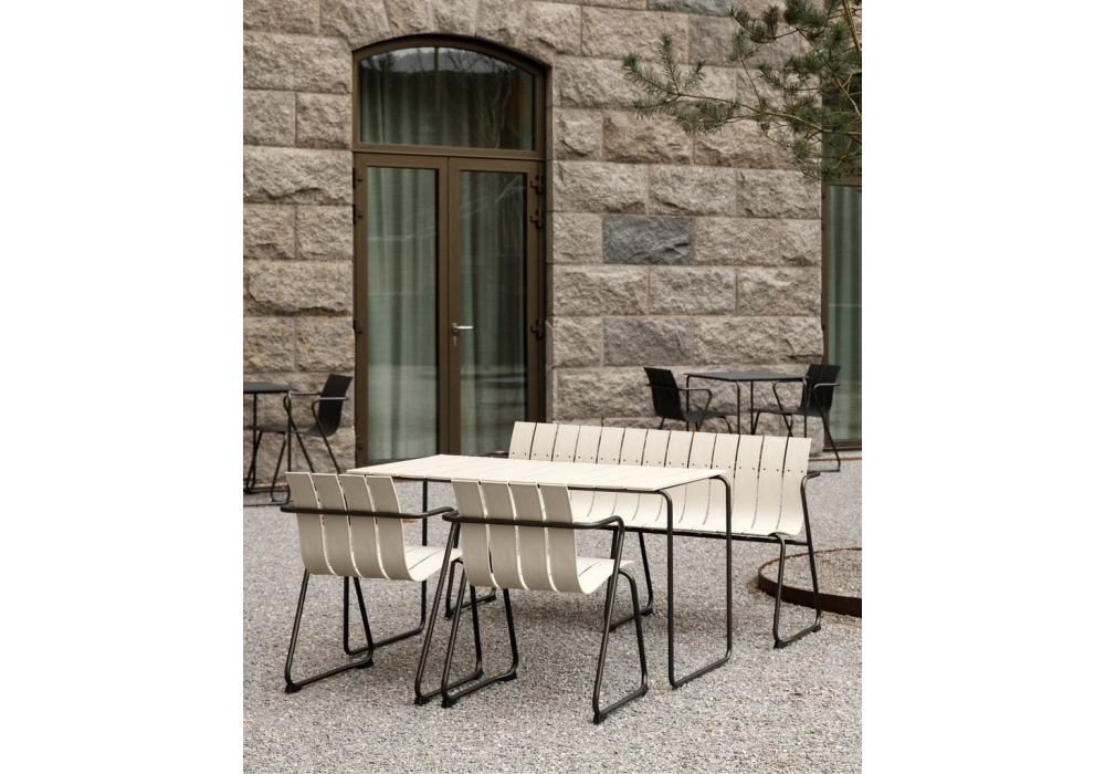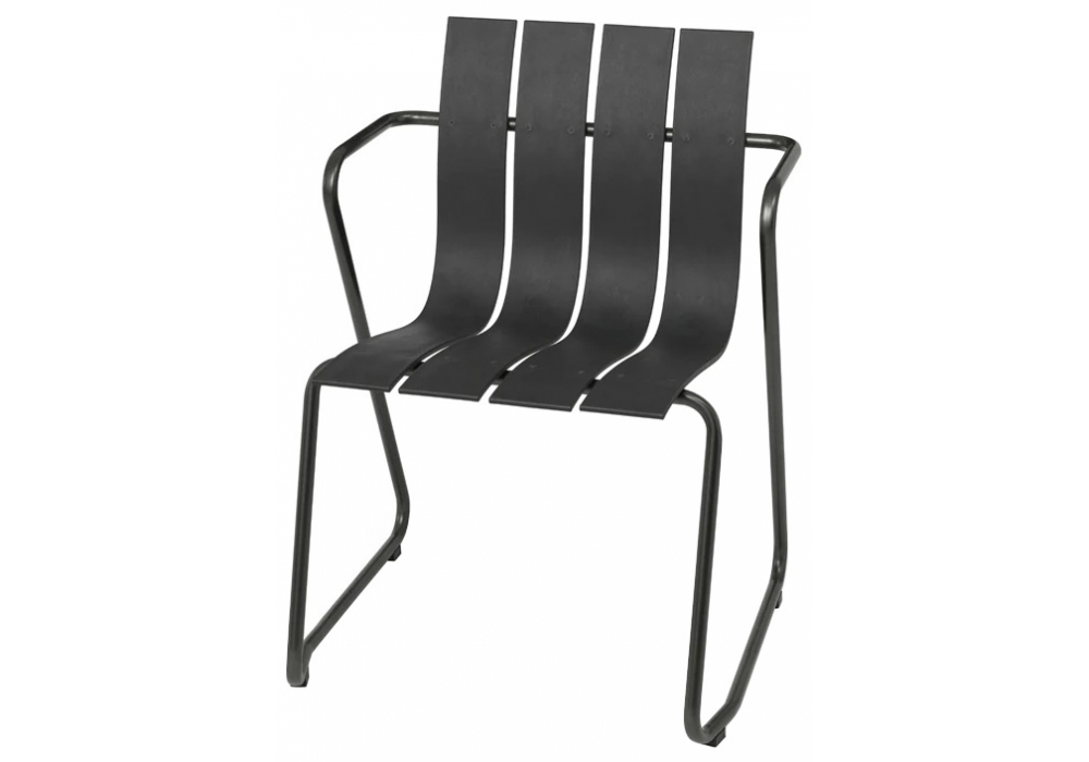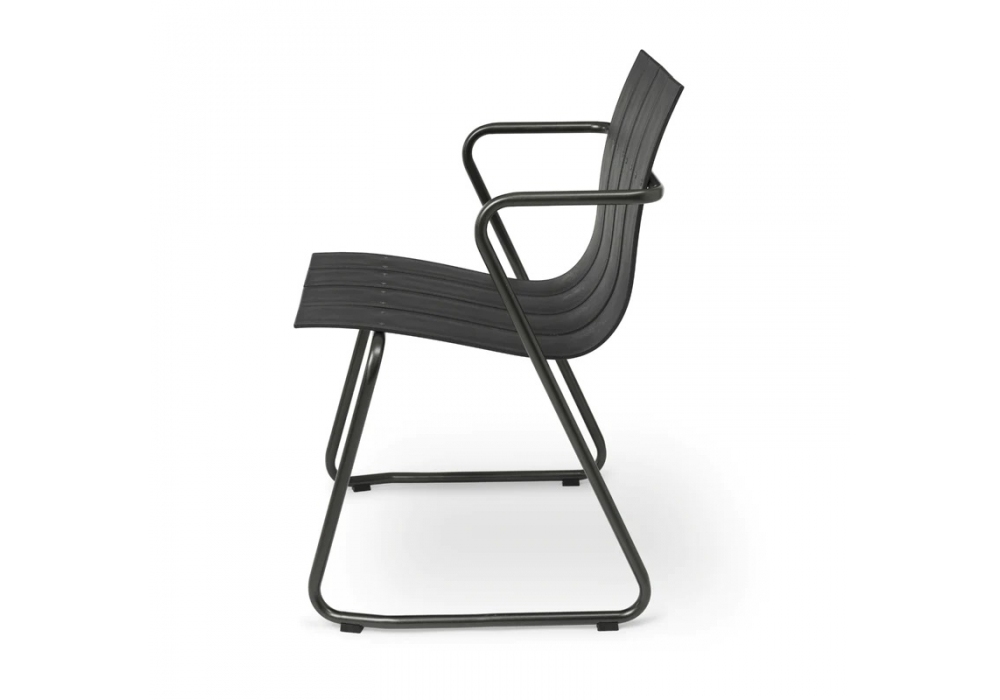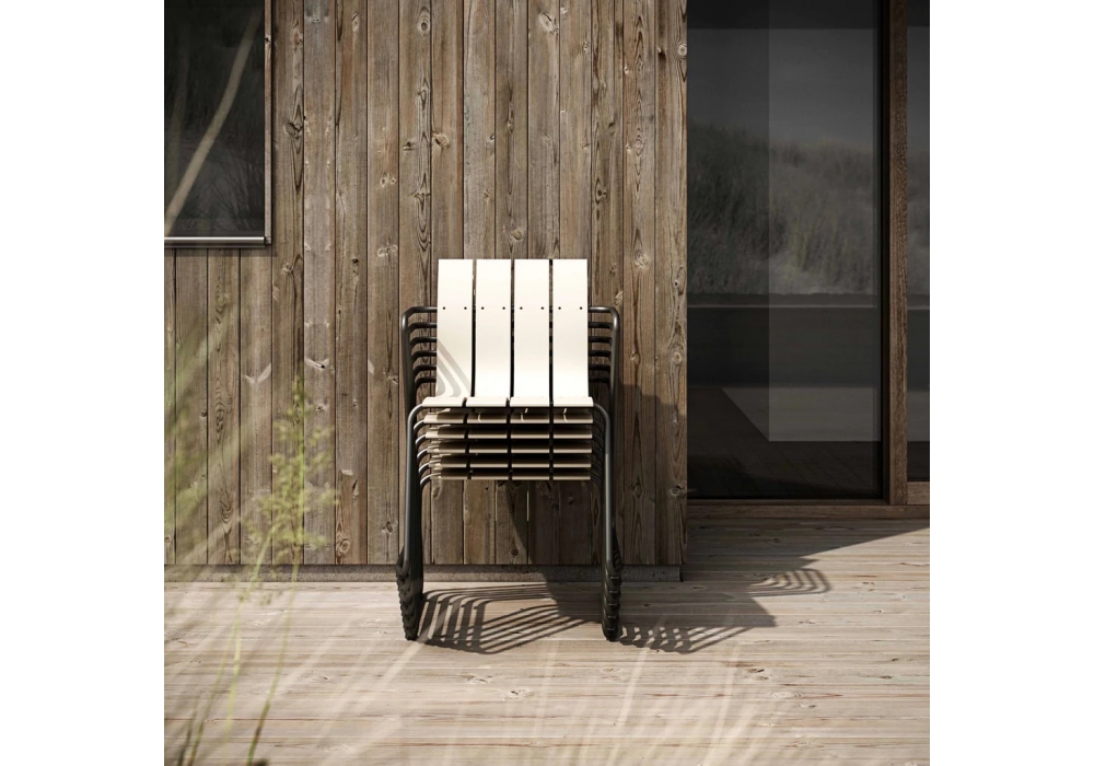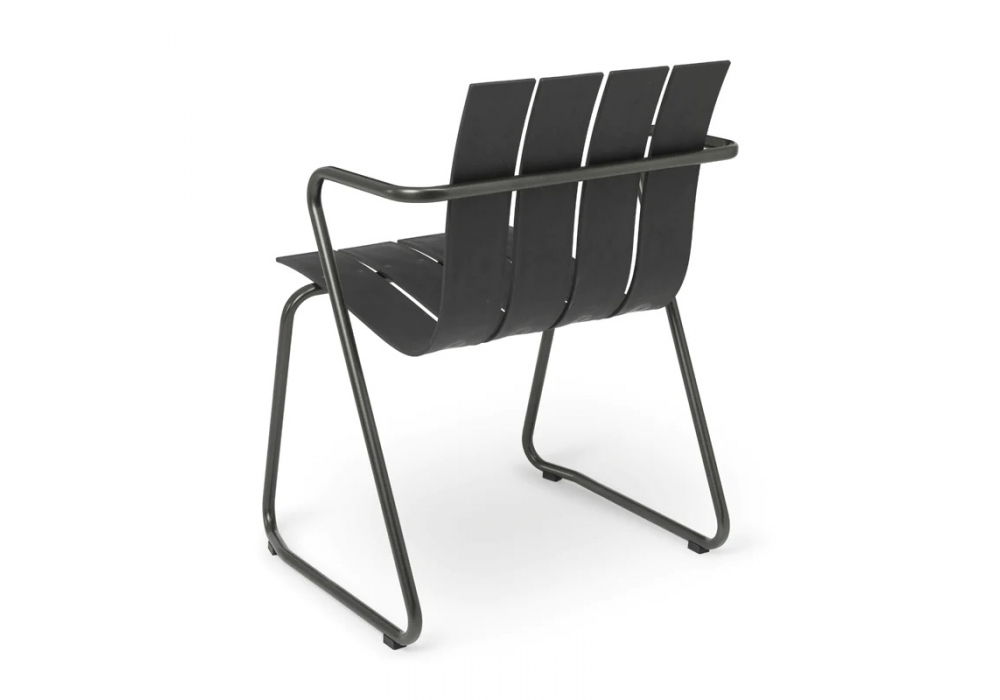 Ocean designed by Joergen and Nanna Ditzel for Mater is a chair from the Ocean collection of tables and chairs in recycled plastic from ocean waste. The series is characterized by its light structure with repeated slats and metal frames, made and tested for outdoor use.