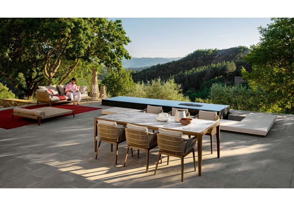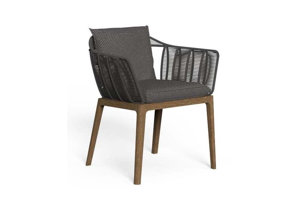 Cruise Teak designed by Ludovica and Roberto Palomba for Talenti is a chair with wooden structure, back and armrests in synthetic rope and cushions with fabric for outdoor, waterproof.