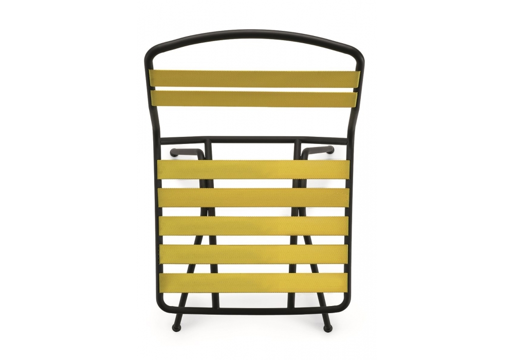 2073-2074 Dan designed by Patrick Norguet for Zanotta is a chair with structure in 304 stainless steel painted for outdoor in iron gray or matt black. Seat and back made with elastic ribbons in polyester yarn in yellow, rope, anthracite and blue.
