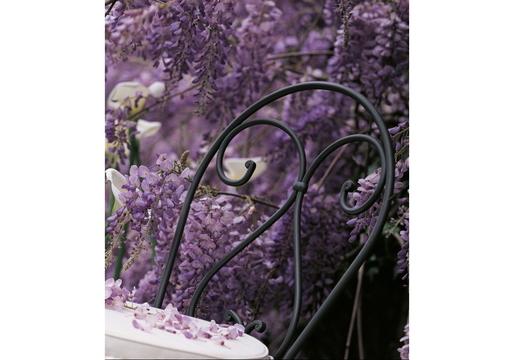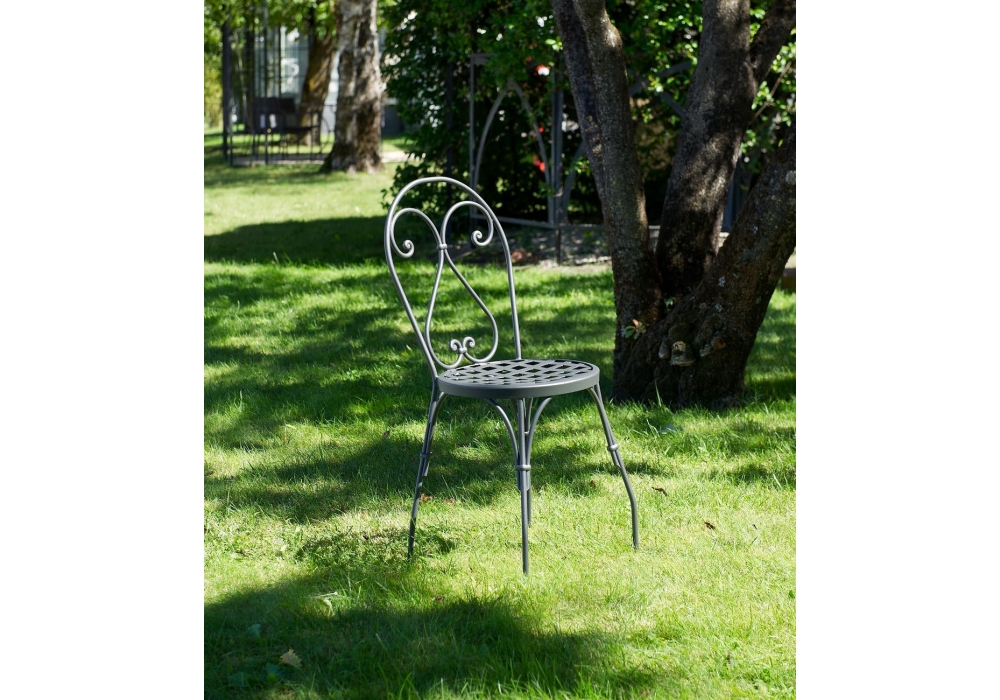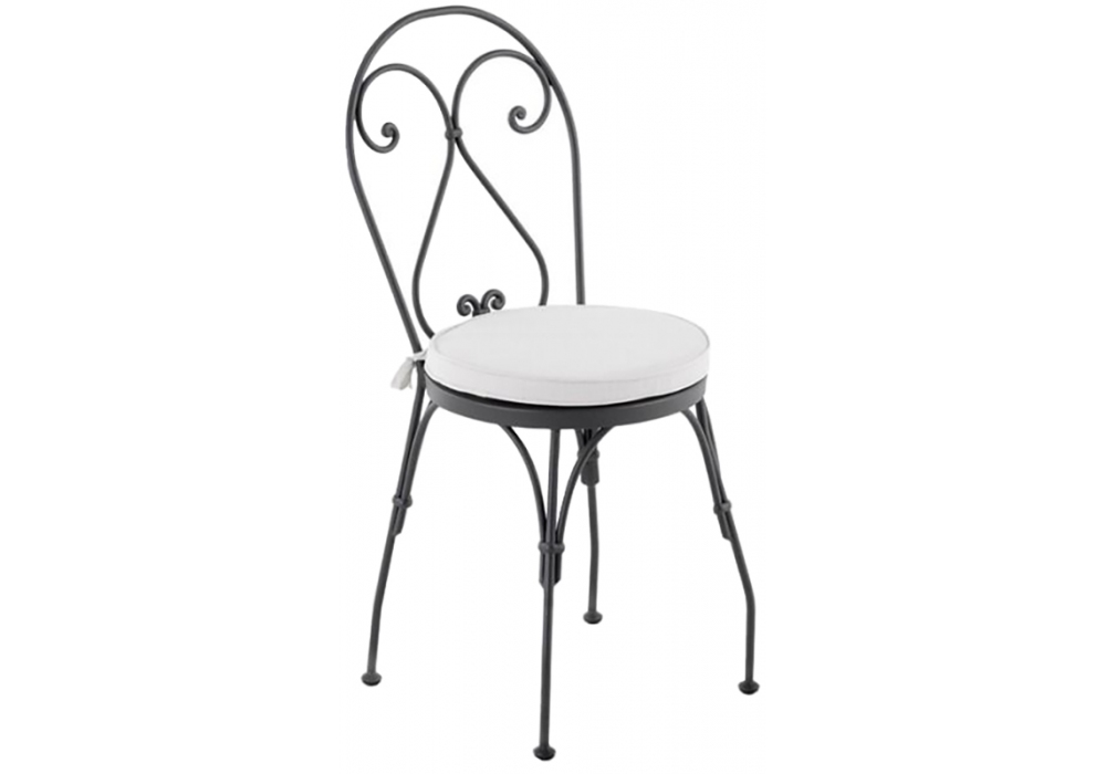 Aurora produced and signed by Unopiù is a chair with hand-wrought iron structure and painted in graphite color. The seat cushions are made of milk-colored acrylic fabric.