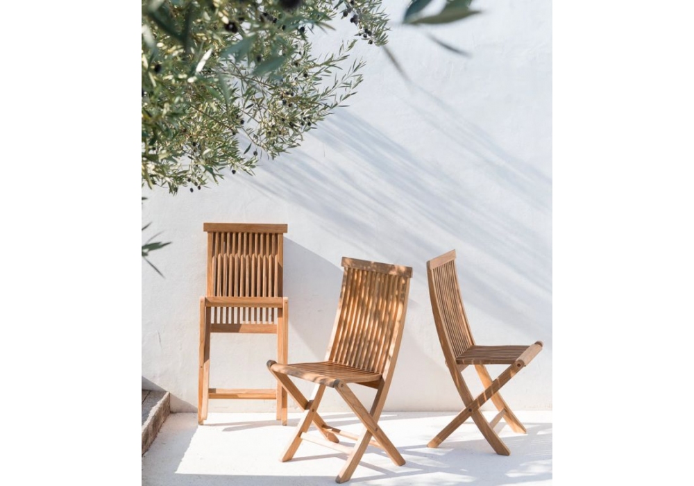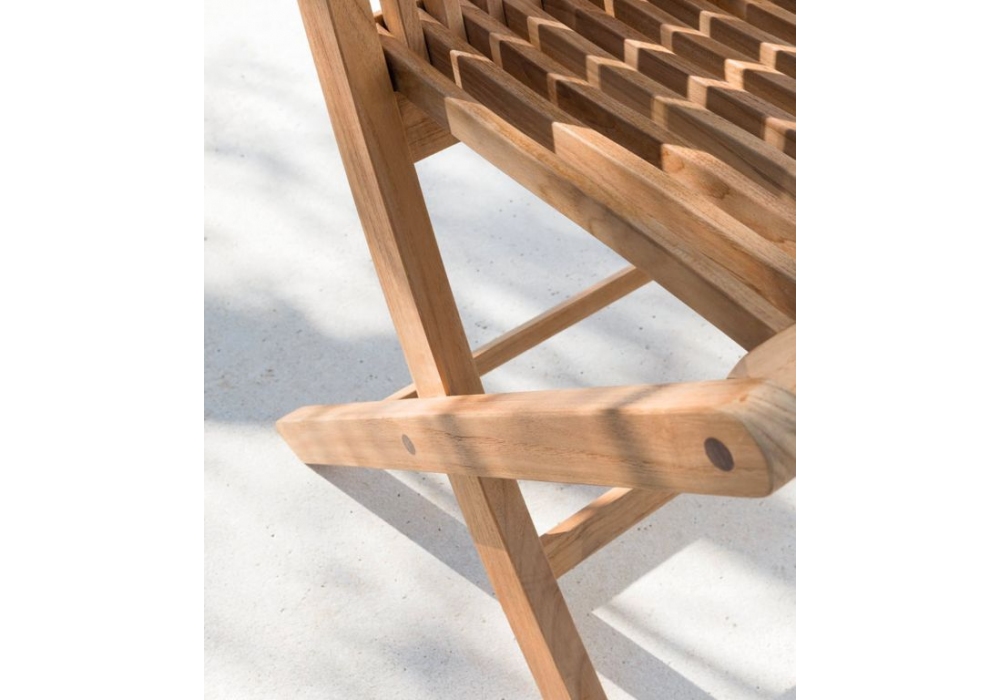 Chelsea produced and designed by Unopiù is a folding chair with natural teak wood structure with milk-colored acrylic cushions.