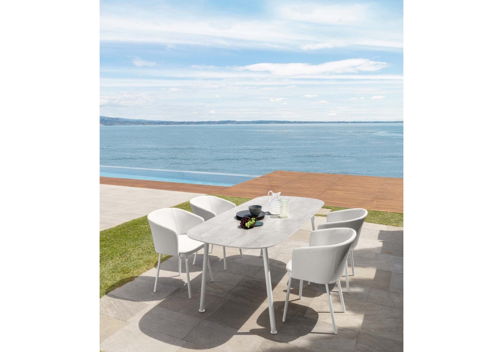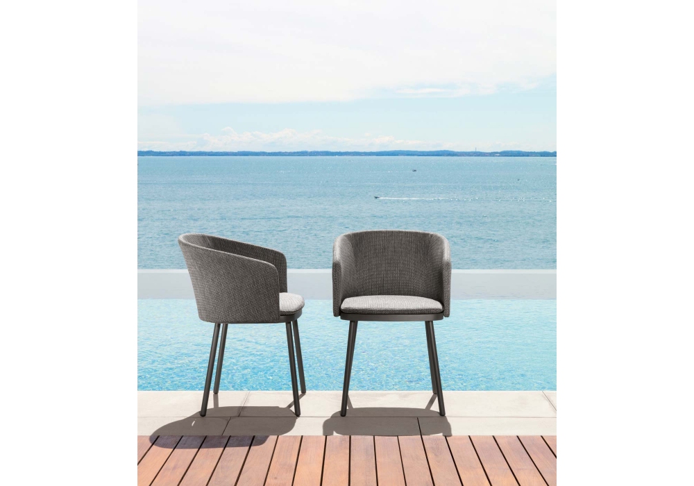 Slam designed by Ludovica + Roberto Palomba for Talenti is an outdoor dining chair with structure in powder-coated aluminum. Backrest and cushions have removable covers and are upholstered in weather resistant outdoor fabrics.