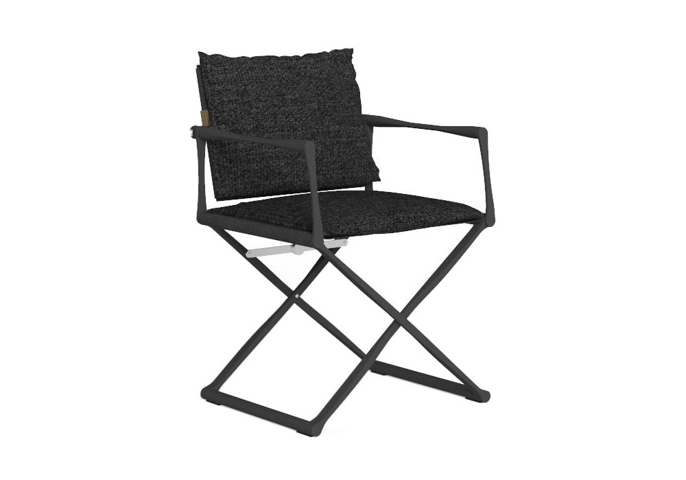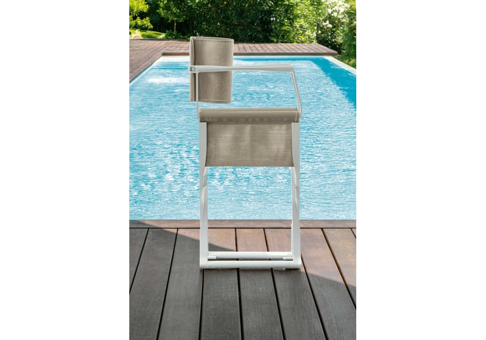 Riviera designed by Jean Philippe Nuel for Talenti is a director chair for outdoor use. Structure in powder-coated aluminum, leather finish detail in the backrest. Cushions have removable covers and are upholstered in weather resistant outdoor fabrics.