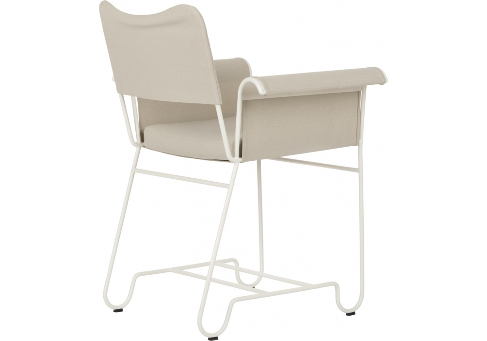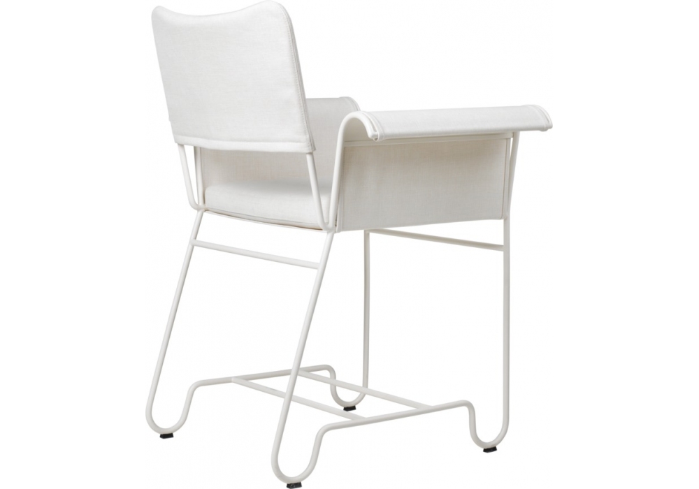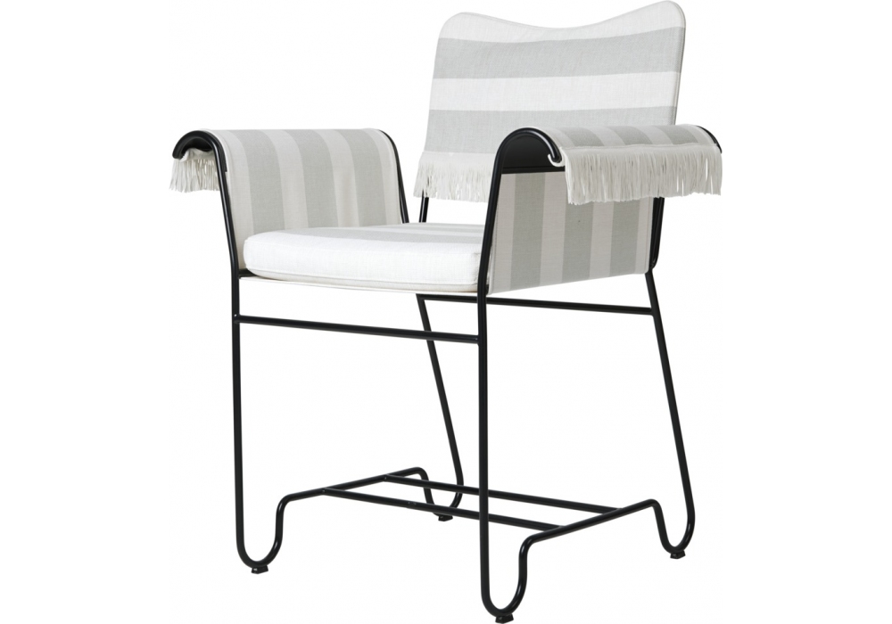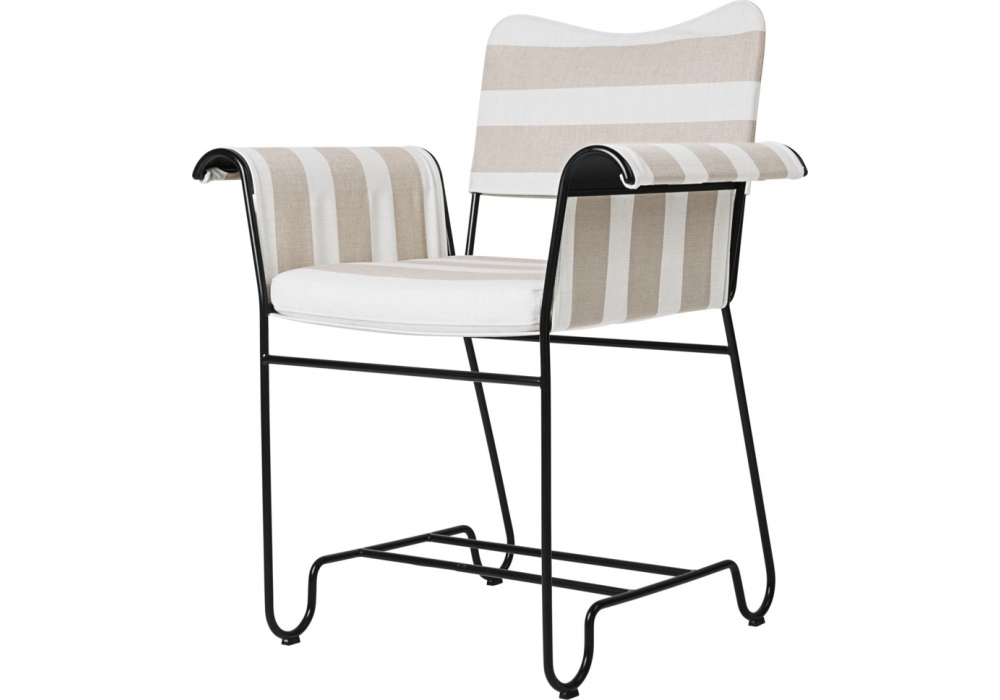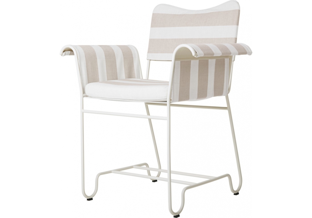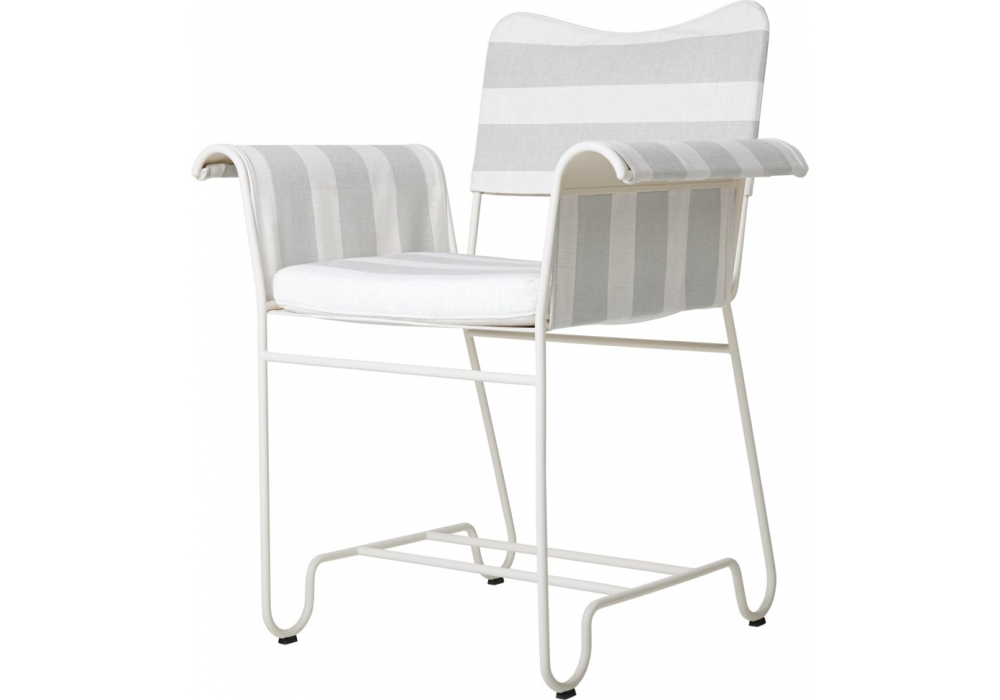 Tropique designed by Mathieu Matégot for Gubi is an outdoor chair with frame made from stainless steel rods, and outdoor fabric upholstery seat cushion, backrest and armrest.