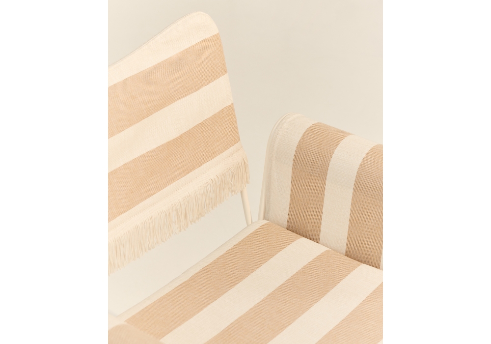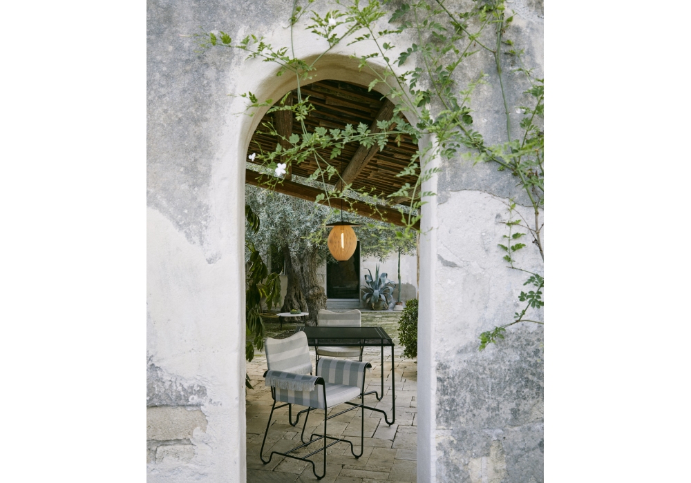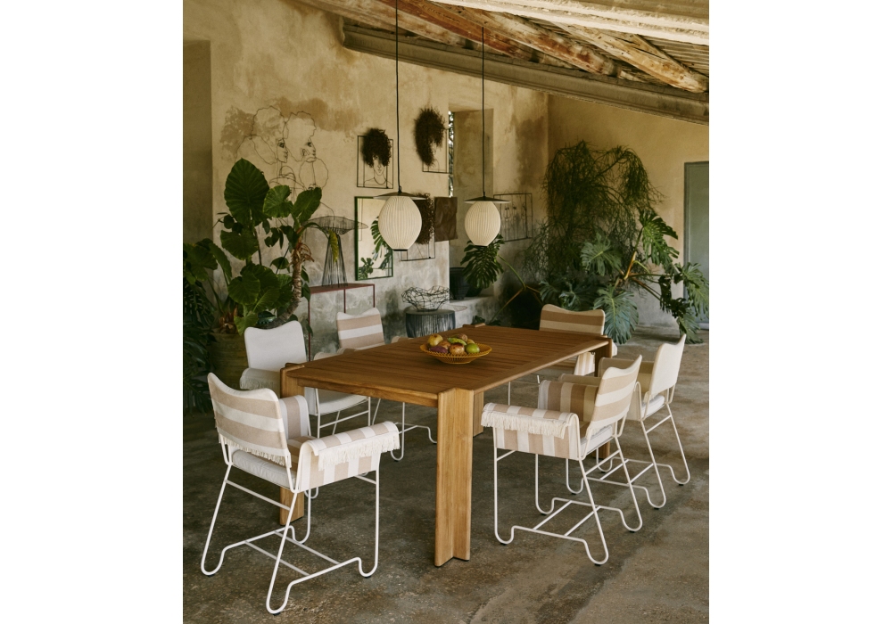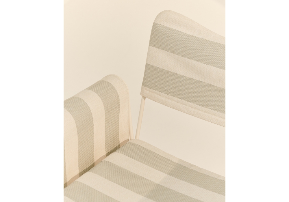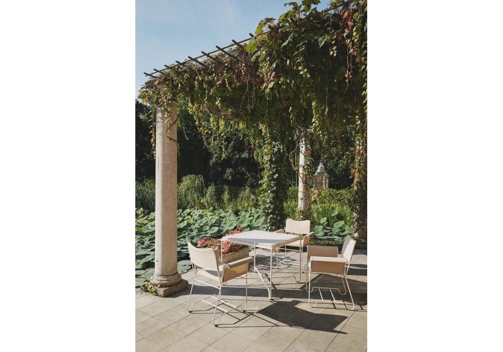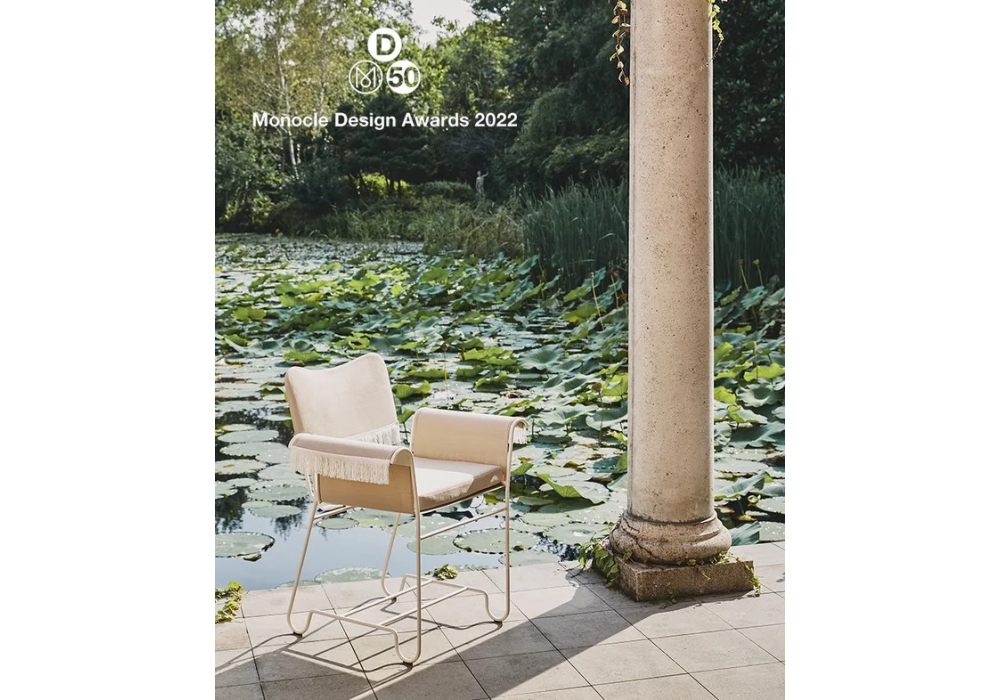 Tropique designed by Mathieu Matégot for Gubi is an outdoor chair with frame made from stainless steel rods, and outdoor fabric upholstery seat cushion, backrest and armrest.