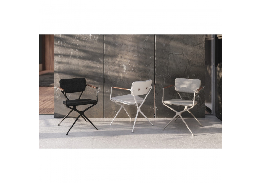 Exes designed by Kris Van Puyvelde for Royal Botania is an outdoor chair with aluminum structure and teak armrests. Available in different finishes. Optional seat and back cushions.