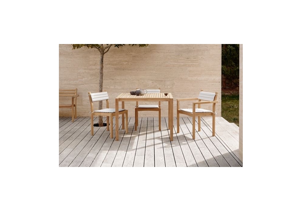 AH502 designed by Alfred Homann for Carl Hansen & Søn is an outdoor chair with armrests with solid teak wood frame. Available with or without seat or back cushions, covered in Agora Life Oat 1760 fabric.