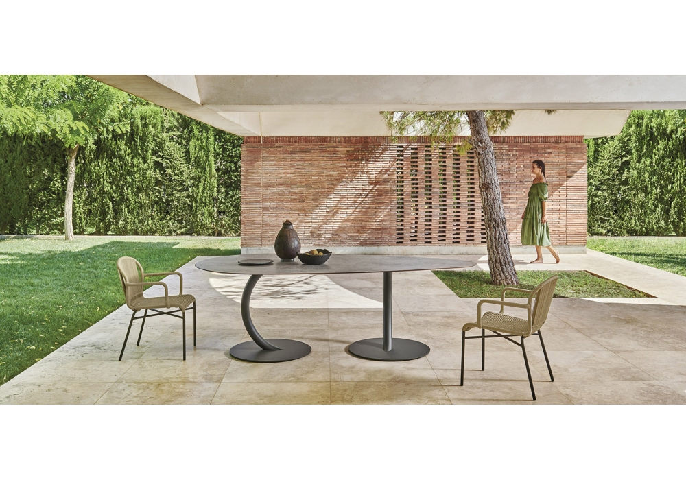 Cricket designed by Anki Gneib for Varaschin is a chair with armrests hand woven in synthetic fiber with powder coated aluminum frame. Available in different finishes. Optional pillow.