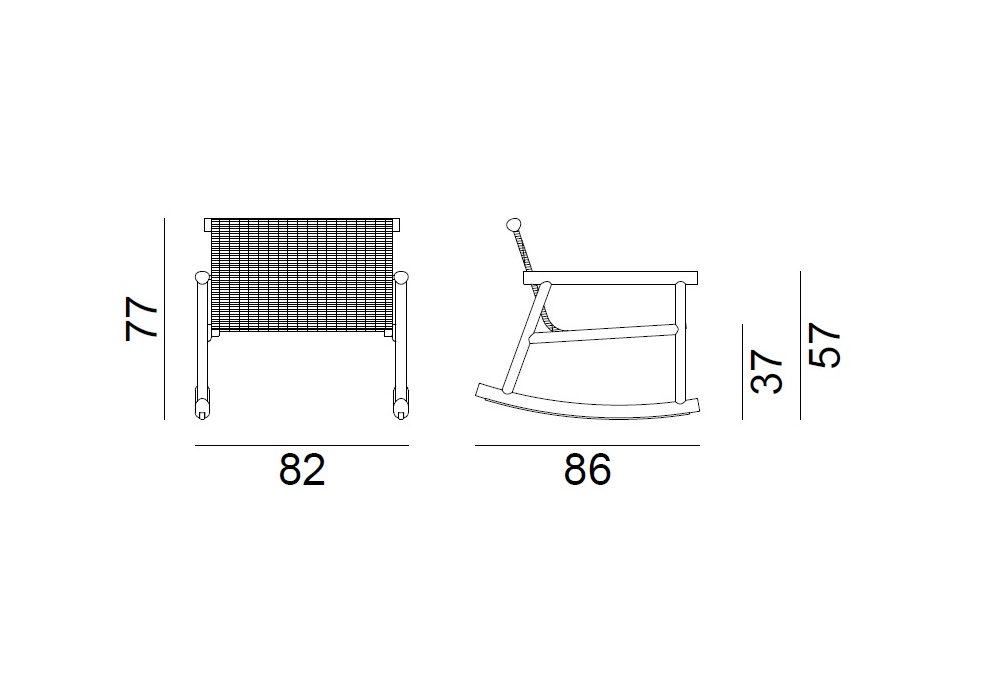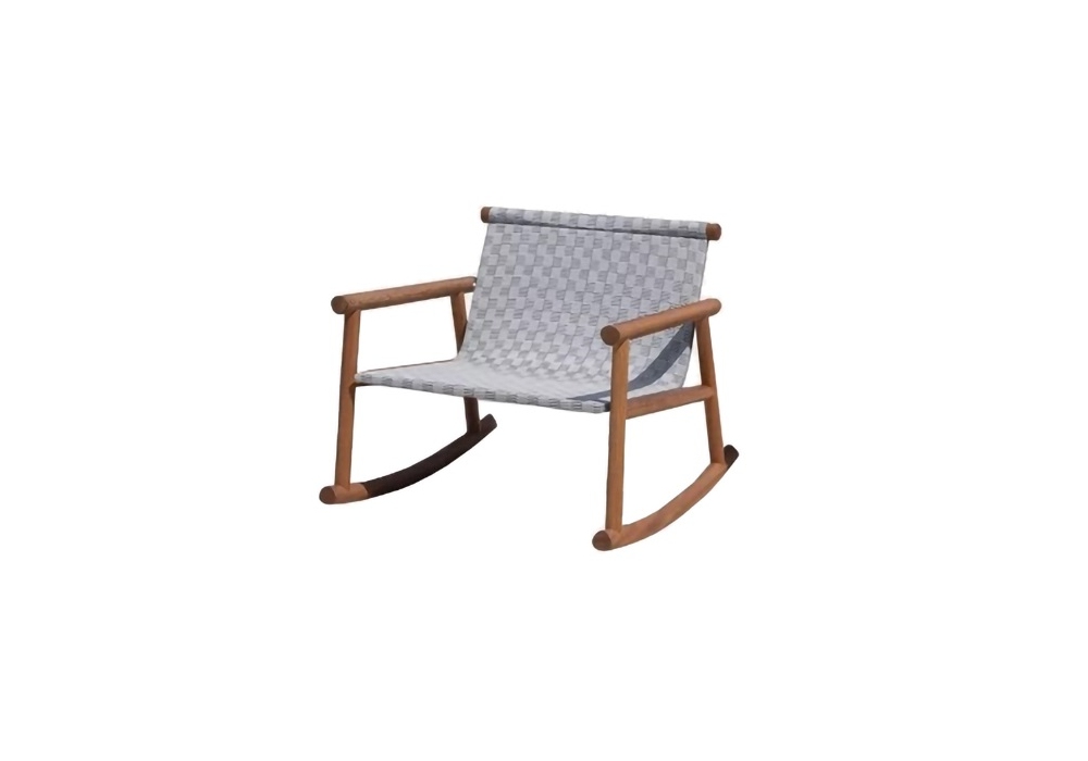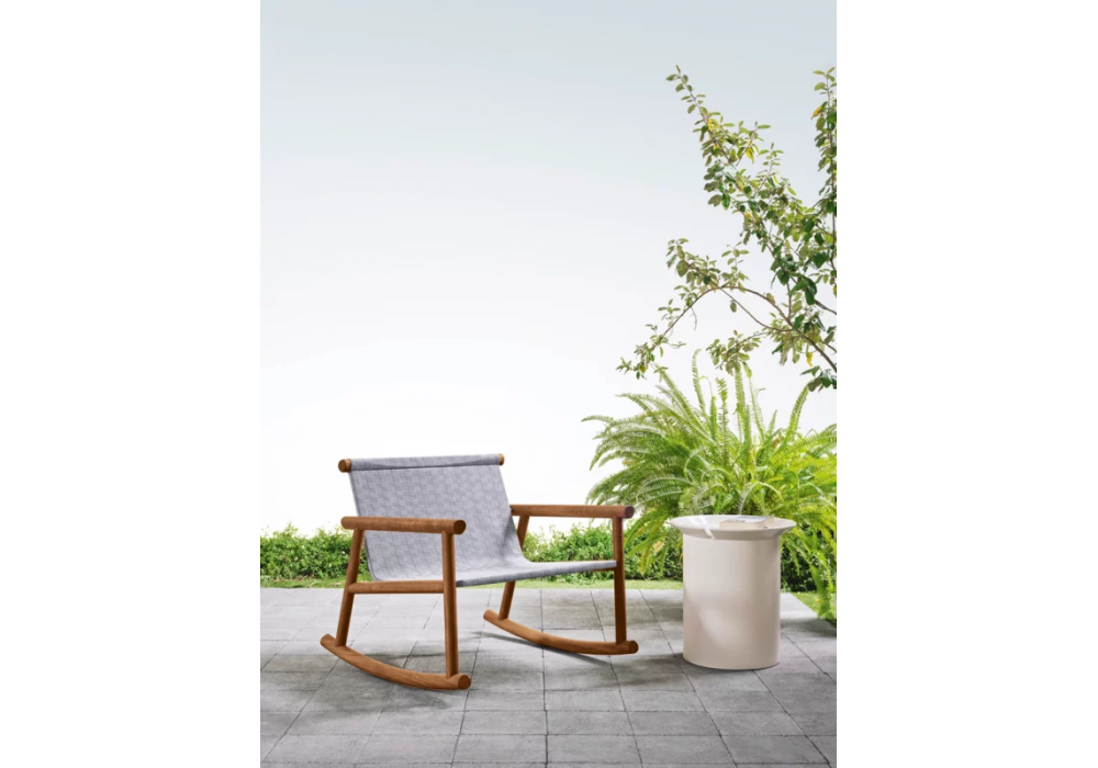 Hashi designed by Federica Biasi for Gervasoni is a rocking chair with armrests made with oiled iroko wood structure, upholstery in blue or beige Accardi Jacquard fabric.