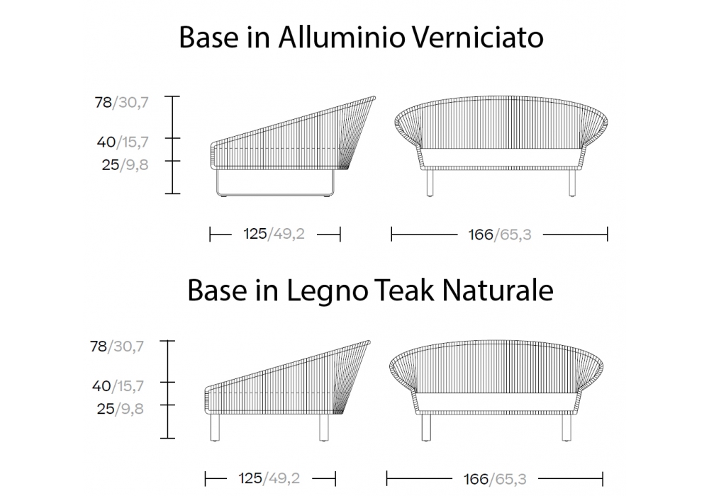 Construction material Alluminio; Alluminio e Legno Teak; Corda Sintetica; Tessuto.