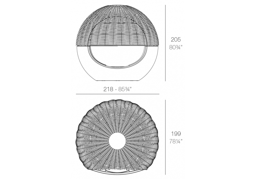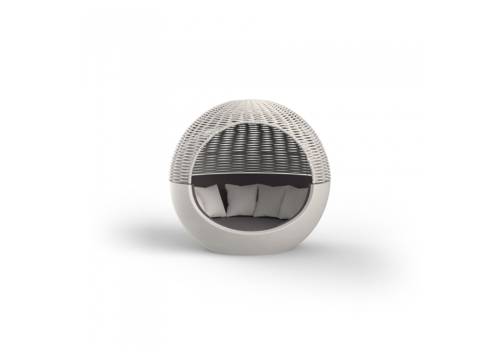 Moon designed by Ramón Esteve for Vondom is a daybed by circular shape with rotating system on which its base rests, which allows the piece to rotate on its own axis. Articulated through two hemispheres, the base is made of rotational moulded polyethylene with the possibility of LED backlighting, while the parasol is made with a polypropylene cord braid. Moon is an ideal piece for leisure or chill-out environments.