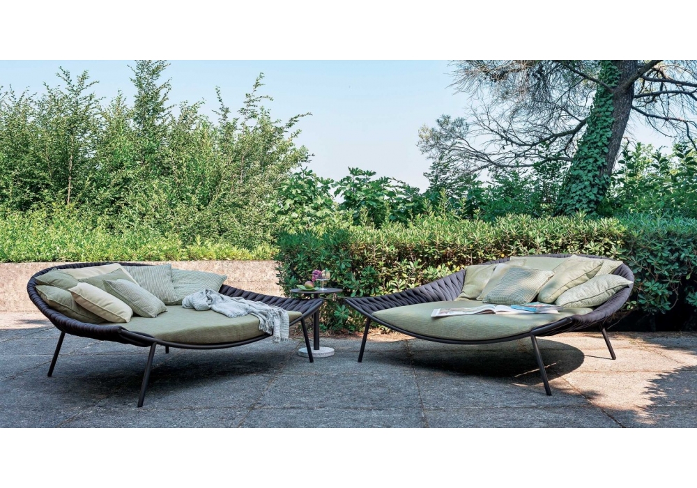 Arena designed by Gordon Guillaumier for Roda is an outdoor daybed composed of powder coated stainless steel structure upholstered with padded belt made of polyester and cushion seat.