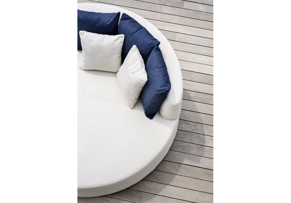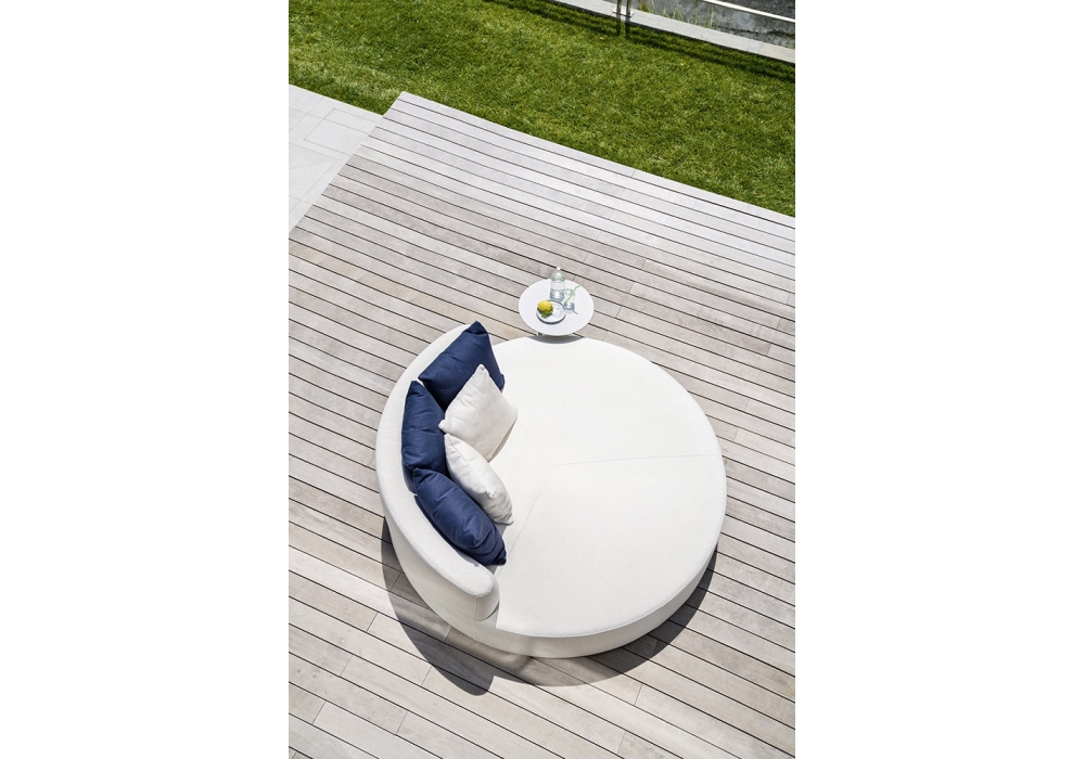 Belt designed by Daniele Lo Scalzo Moscheri for Varaschin is a daybed with supporting structure in solid okumè wood and padding with Dryfeel rubber for outdoor use. Available in single-fabric or bi-fabric version with different colours.