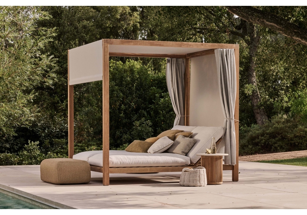 Pure designed by Andrei Munteanu for Tribù is an outdoor sofa bed with a structure entirely made of teak wood enriched with adjustable side and back curtains. The cushions are padded and covered in fabric suitable for outdoor use. Pure is available in different fabric finishes.
